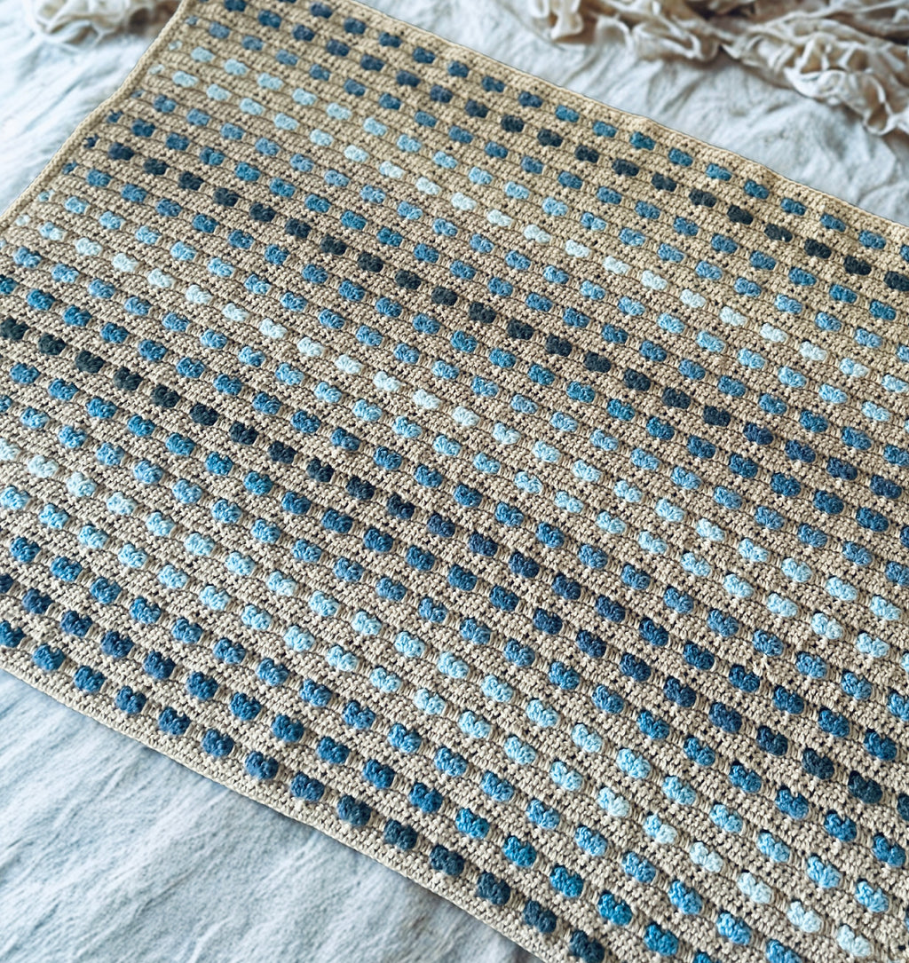 Crafted with soft, breathable yarn, this blanket features a beautiful pebble-dot texture in soothing shades of blue against a warm neutral base—perfect for newborn snuggles, pram outings, tummy time, or nursery décor.