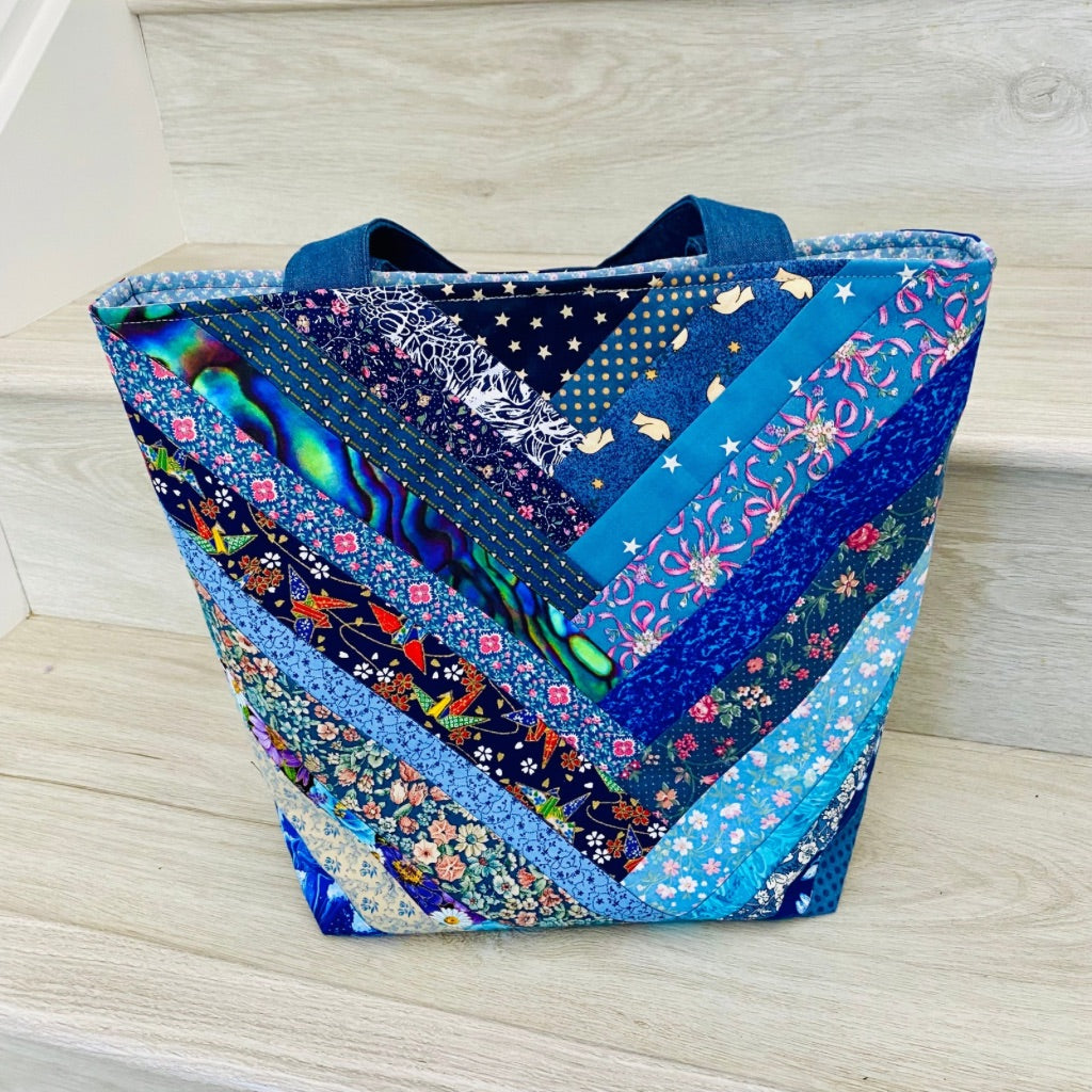This handmade strip-pieced patchwork tote captures the beauty of blue in every shade - from soft sky tones to deep midnight indigo.