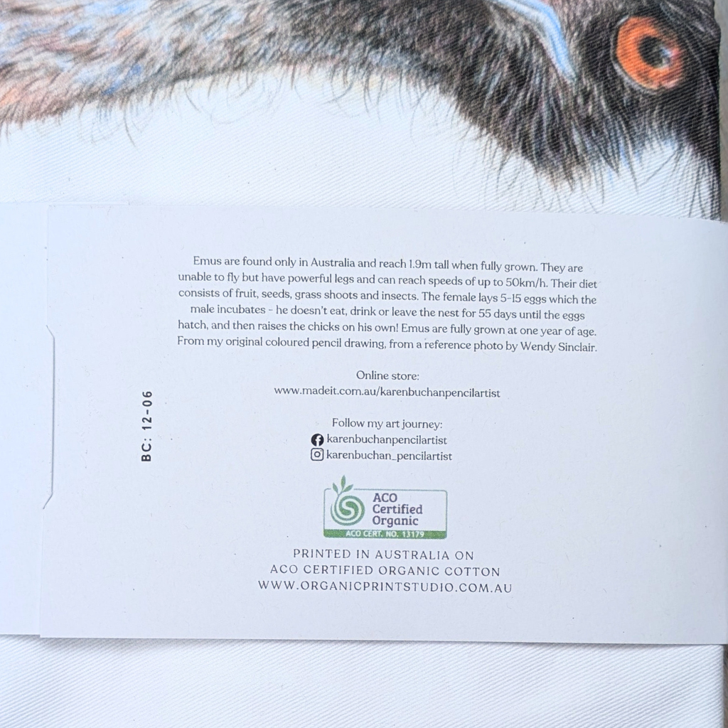 This beautifully soft 100% cotton tote bag features my coloured pencil drawing of a curious emu. Designed and illustrated in my home studio in the Dandenong Ranges east of Melbourne, these tote bags are printed locally on 100% certified organic cotton and come with a 100% recycled cardboard wrap. There is a gusset in the base of the bag so it is nice and roomy without being too big, and the nice wide strap makes it comfortable to carry.