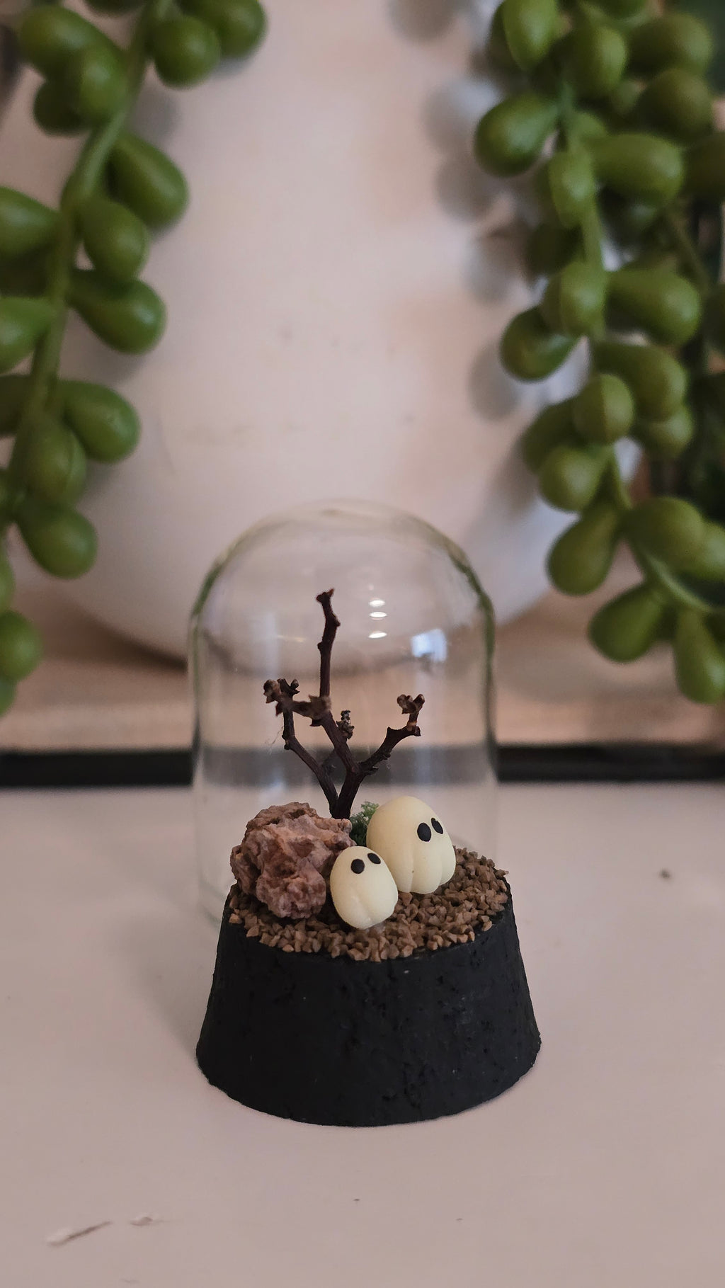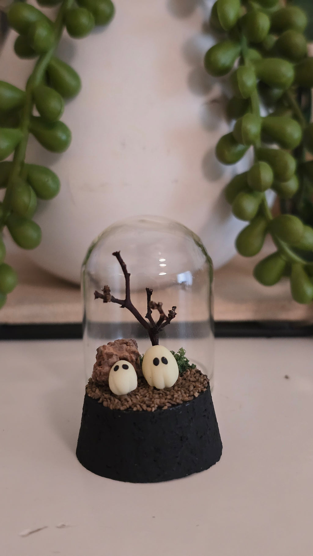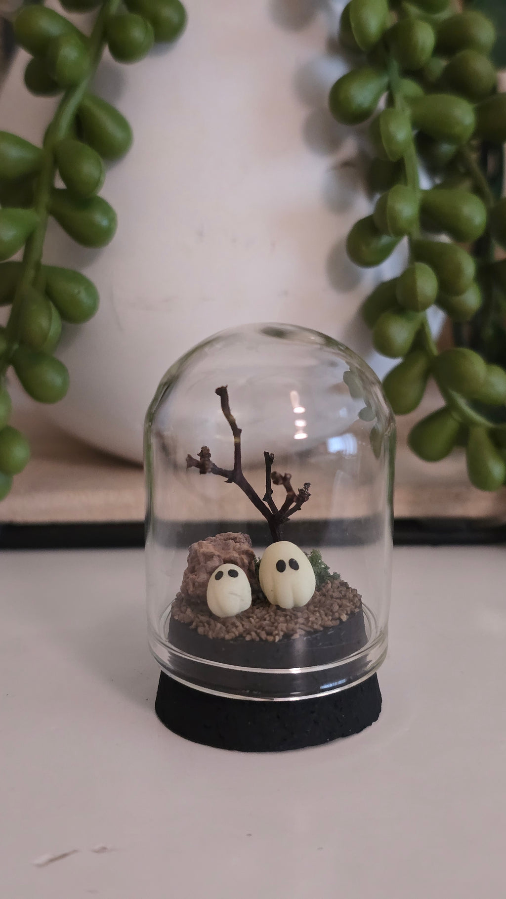 Everything apart from the glass dome and cork base is handmade by me, including the ghost which is made from glow in the dark polymer clay. I assemble all other items using miniature man-made rocks and grass, and the tress are made from Australian native stirlingia dried flowers stems.