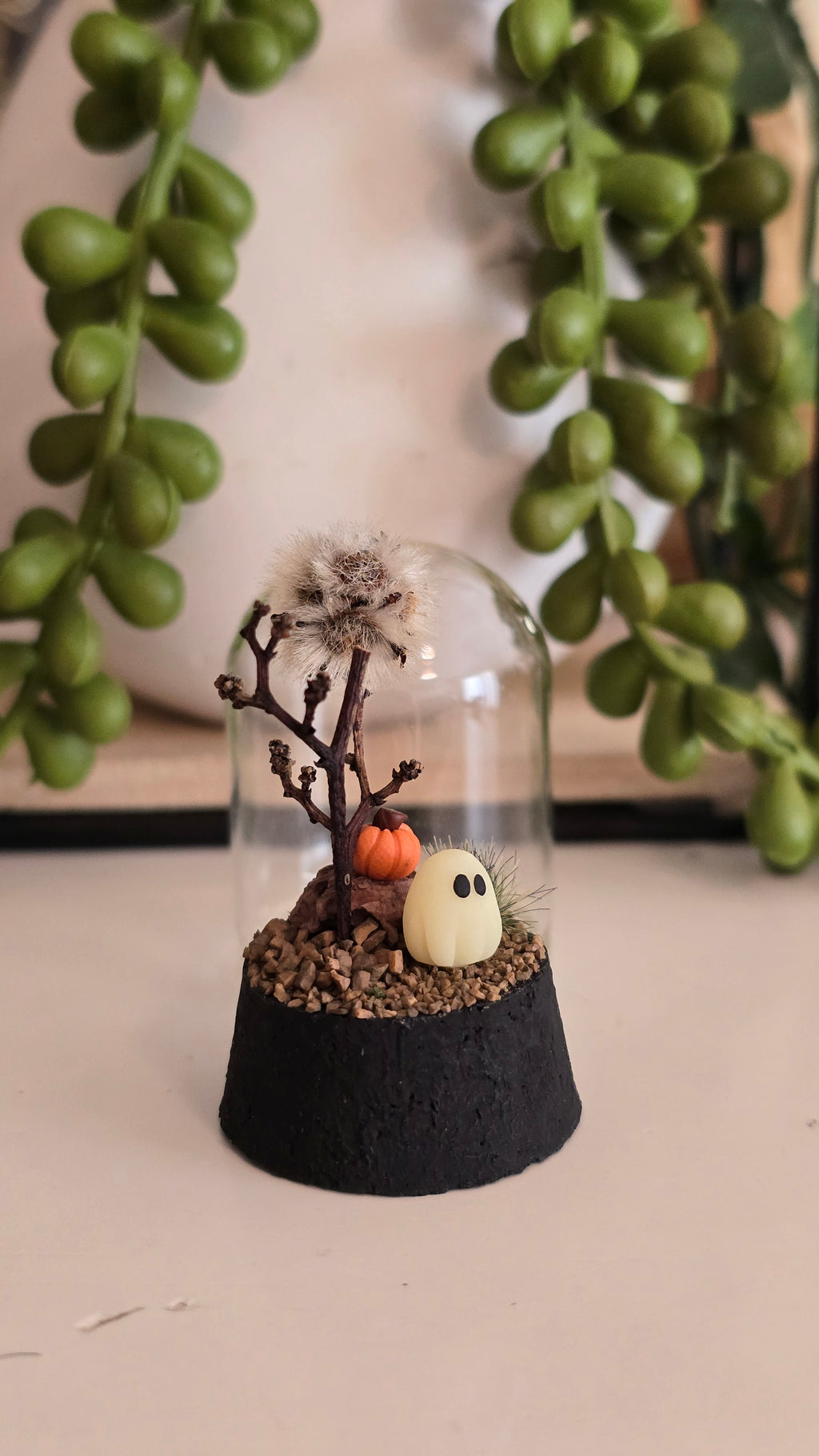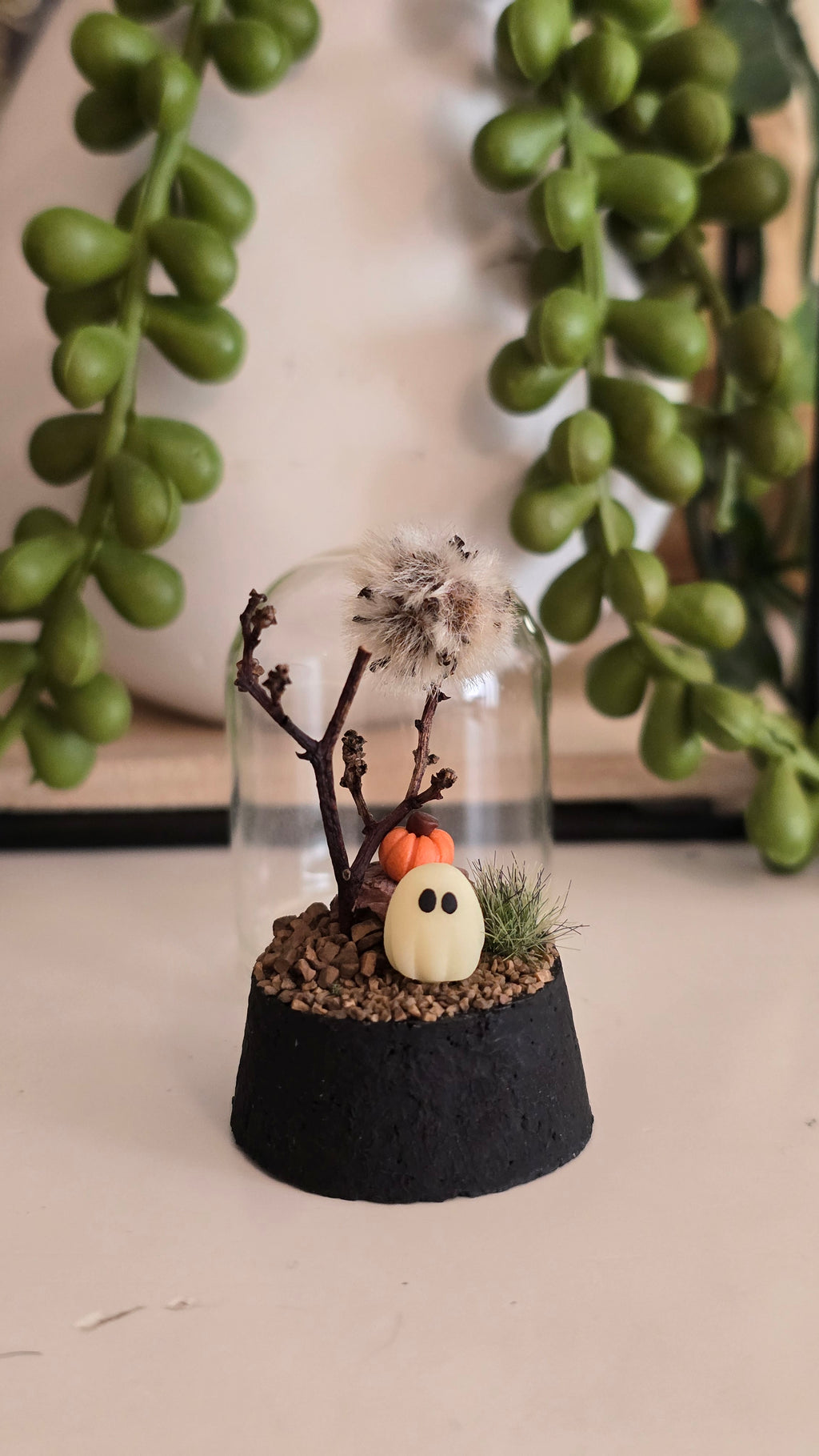 Everything apart from the glass dome and cork base is handmade by me, including the ghost which is made from glow in the dark polymer clay. I assemble all other items using miniature man-made rocks and grass, and the tress are made from Australian native stirlingia dried flowers stems.