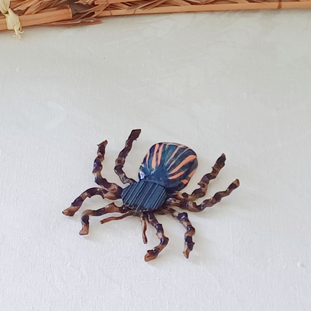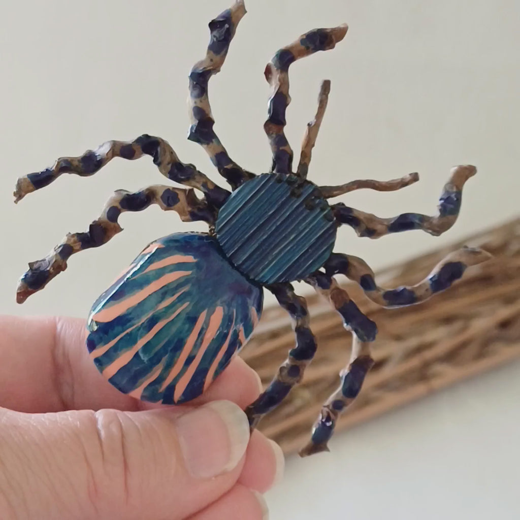 the spider's legs are handcrafted from palm inflorescence spindle. The item is hand-painted with blue acrylic ink and finished with waterproof varnish.
