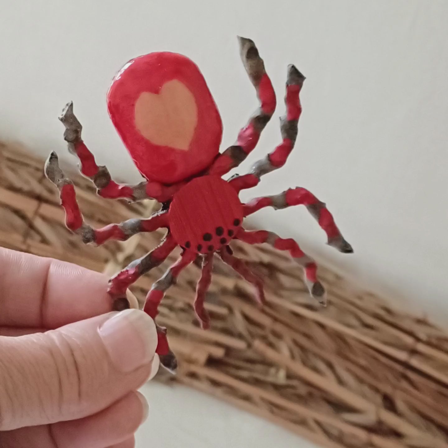 the spider's legs are handcrafted from palm inflorescence spindle. A spider's clay abdomen has heart shaped pattern. The item is hand-painted with red acrylic ink and finished with waterproof varnish.