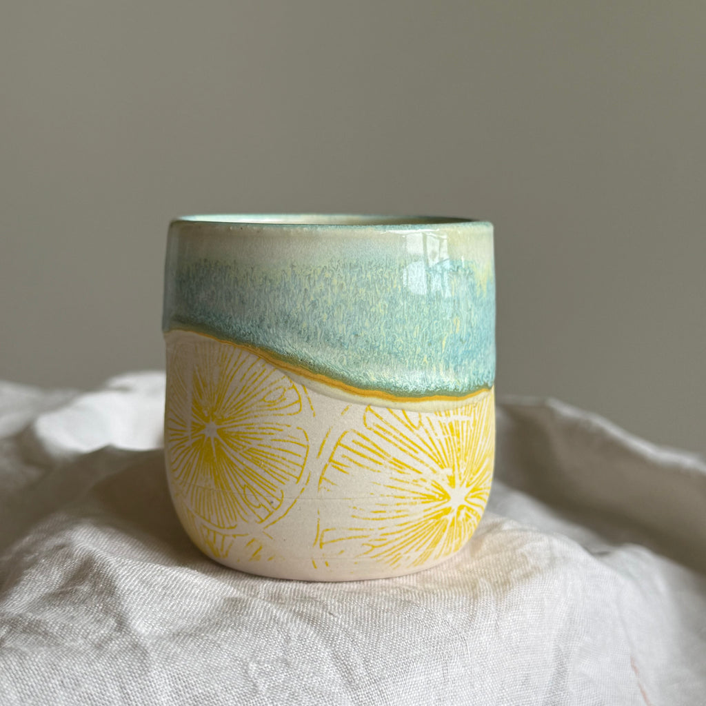 Bring a little sunshine to your daily ritual with this handmade ceramic tumbler. Each cup is wheel thrown and decorated with delicate lemon slice underglaze transfer around the base, creating a fresh citrus pattern and then sealed with Liquid Quartz.
