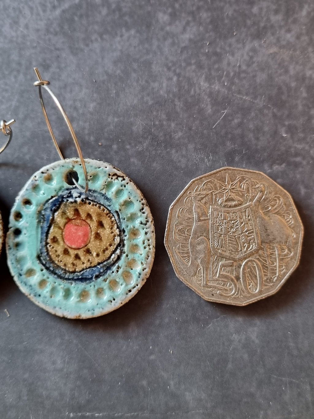 As hand-made pieces, they have unique marks in the clay and glaze which occur naturally during the firing processes. Makers mark appears on the reverse of each earring. In some instances, earrings can be worn on reverse side, creating the potential for 2 pairs of earrings in the one pair.