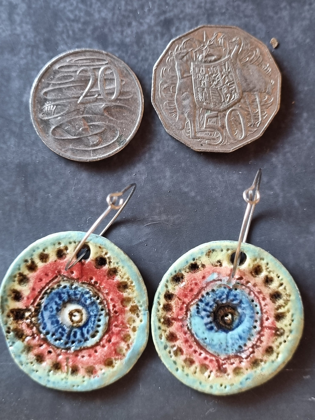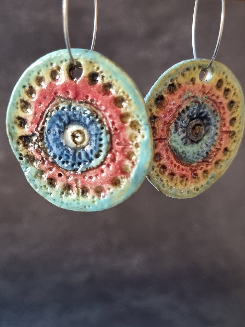 Handmade Stoneware Ceramic Earrings, blue-orange-green multi-coloured, 35mm diameter, pierced ears