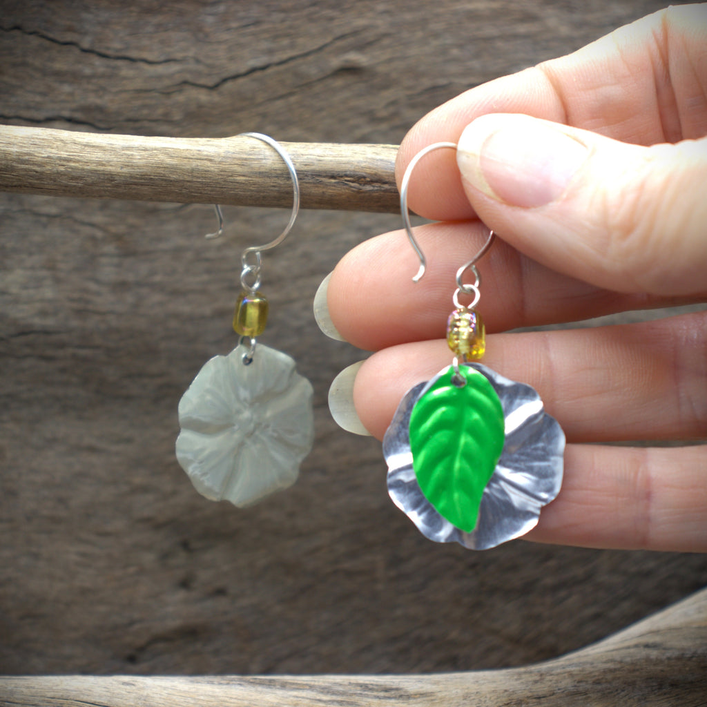 A cute and colourful addition to your earring collection, these handmade Hibiscus Earrings are created from upcycled drink cans! They have a handmade sterling silver circular hook, repurposed beads, and a cute leaf detail on the back for added interest.