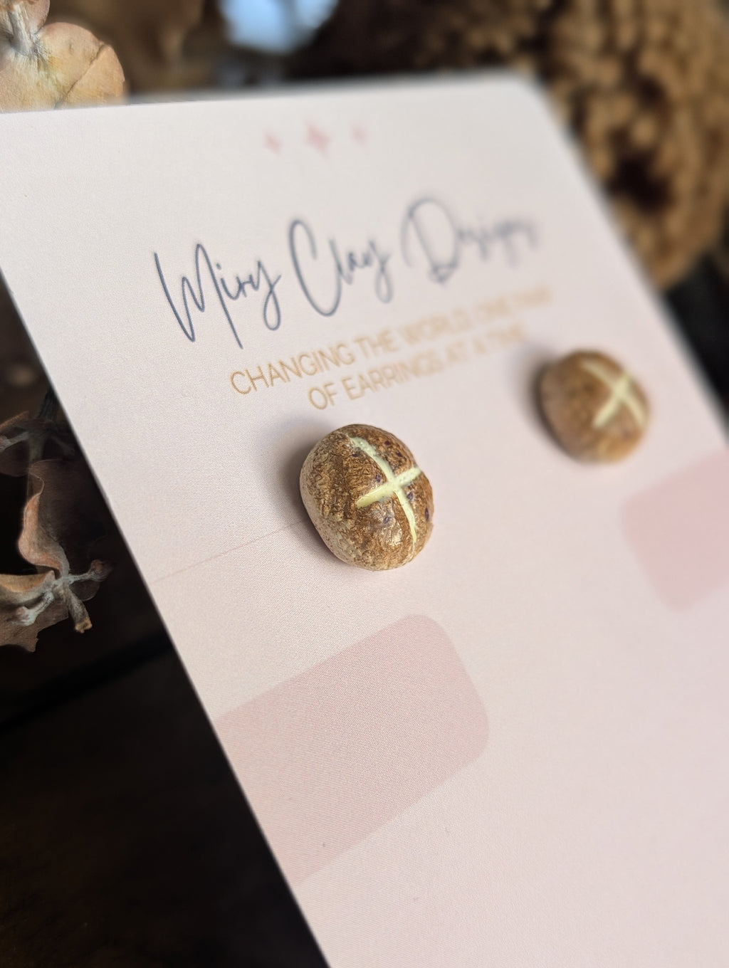 Cute little hot cross buns! Perfect for all ages, they look so good they could be real! Made from polymer clay, with stainless steel backs. Please note every pair is hand shaped and as such size and shape will differ slightly from bun to bun.