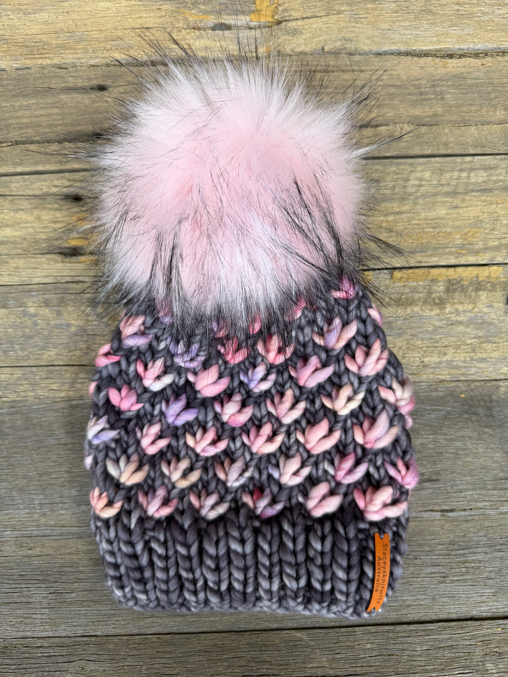 The stunning grey color wool beanie has a contrasting stunning pink and purple lotus flower design and finished off perfectly with a pink flecked faux fur PomPom.