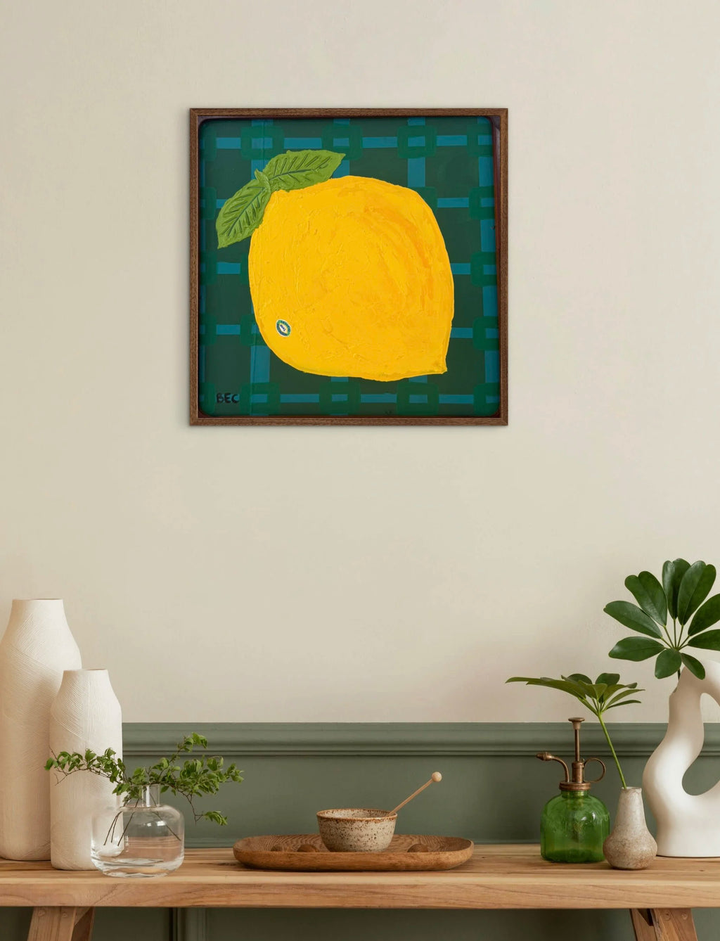 A texturised painting of a lemon with rich, tactile strokes that bring the surface of the lemon to life. The interplay of light and shadow is enhanced by the textured layers, emphasizing the lemon’s natural dimpled skin and adding depth to the overall composition. Charmed perfectly imperfect due to being created on an up-cycled plywood and vintage wooden frame, making it a little ‘rough around the edges’ if you look closely enough, but its still a great piece that would add a playful splash of colour to any space.