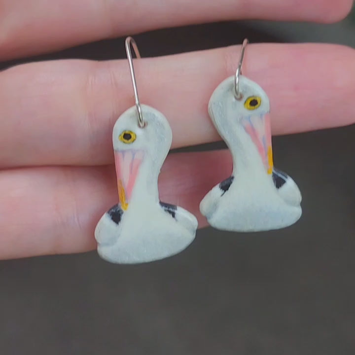 Introducing our new fine art Australian pelican dangle earrings. Hand-carved, individually hand-painted artworks, these characterful waterbirds are a rare earring find! In white and black (with a touch of gold and silver) these are also a perfect "goes with everything" choice.