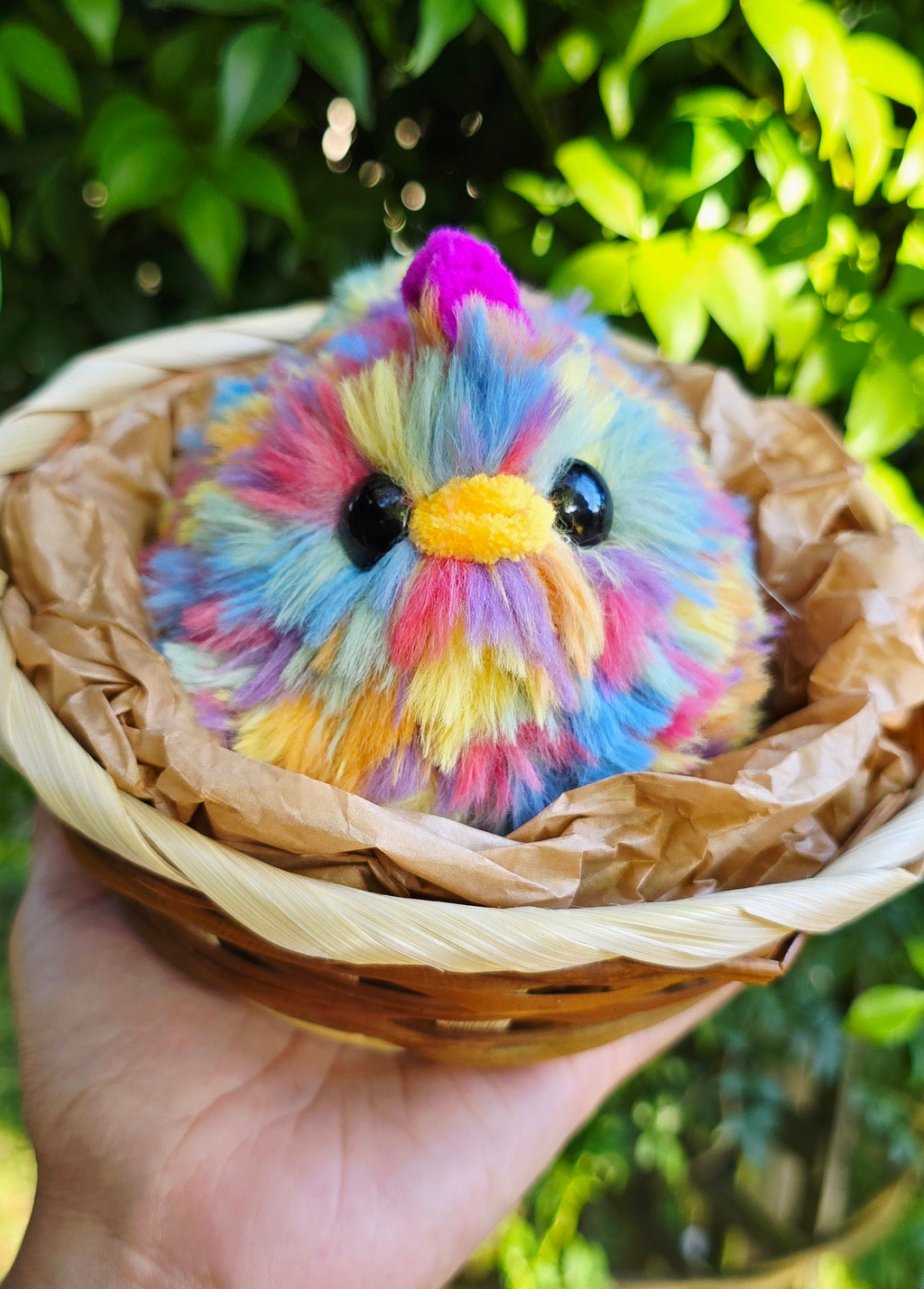 Handcrafted using faux fur yarn, this chicken comes nestled in its own little basket, making it perfect for gifting, displaying, or keeping close when you need a little extra comfort.