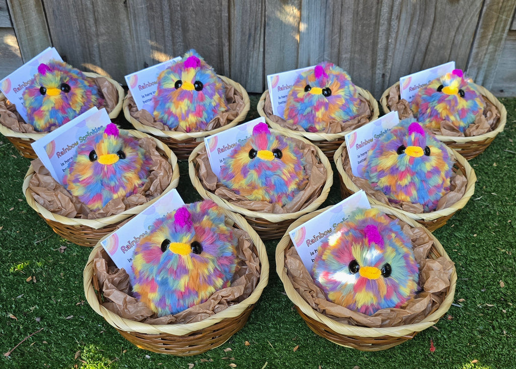 Meet Rainbow Sprinkles, a cheerful little chicken designed to remind you that it’s okay to stand out and shine in your own colourful way. Soft, fluffy, and full of personality, Rainbow Sprinkles is a feel-good companion that adds a pop of joy wherever it goes.