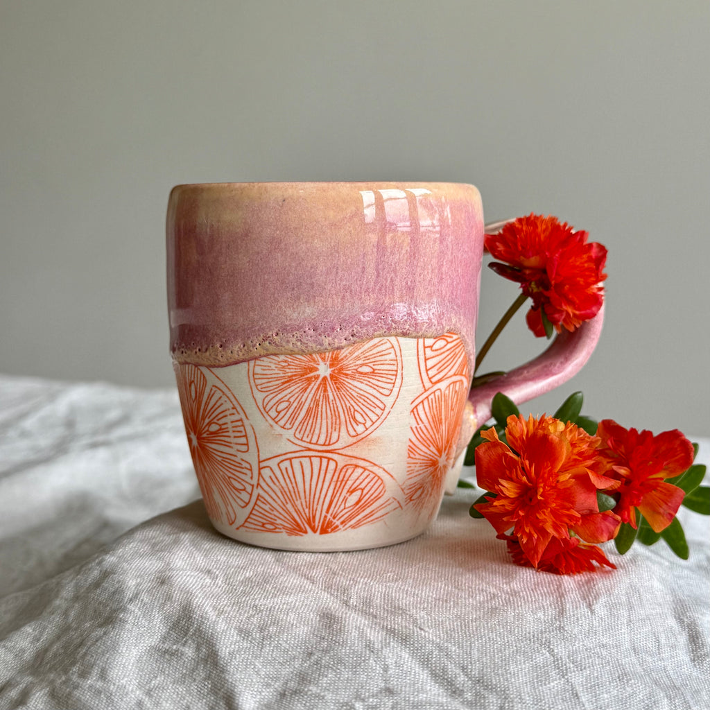 Each of these cups is lovingly wheel thrown by hand, making every piece truly one of a kind. Each cup is wheel thrown and decorated with delicate orange slice underglaze transfer around the base, creating a fresh citrus pattern and then sealed with Liquid Quartz. The glazes flow and settle organically, creating beautiful variations that ensure no two cups are ever exactly alike.