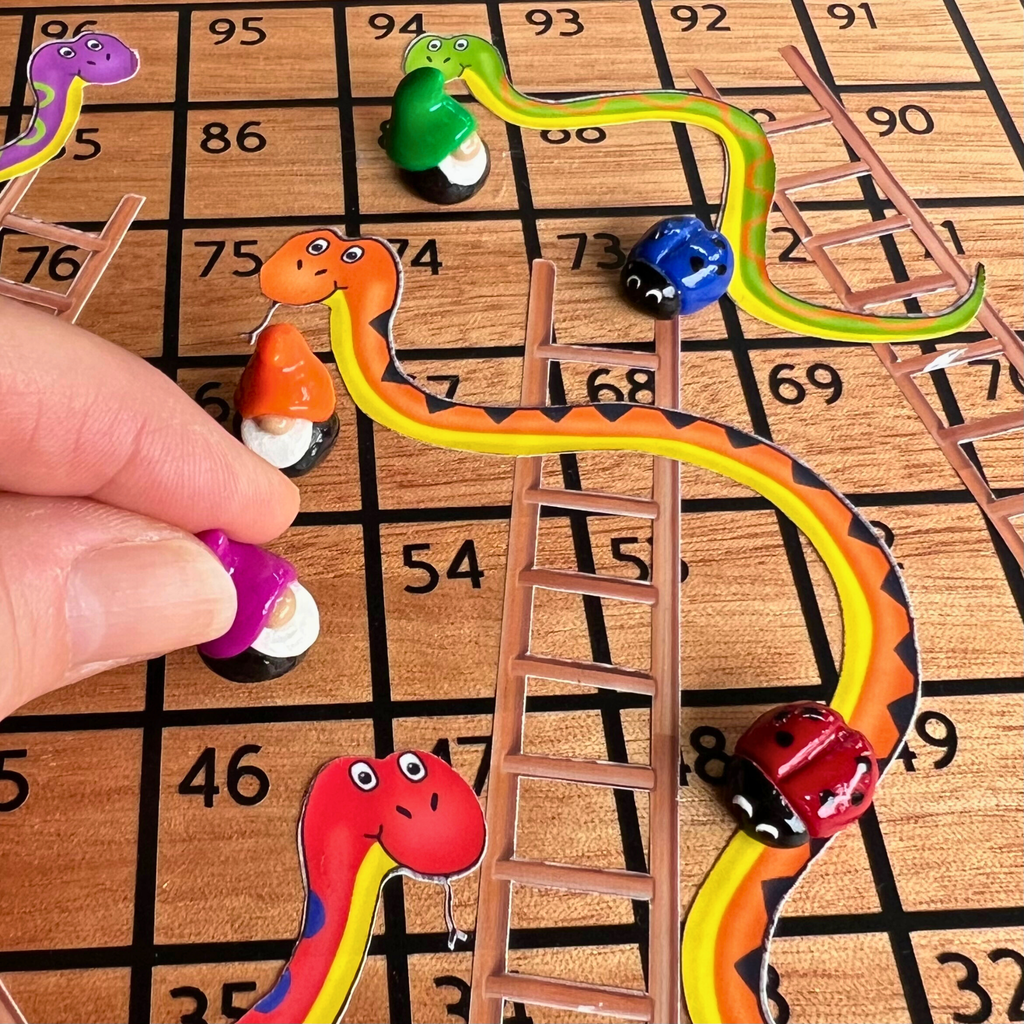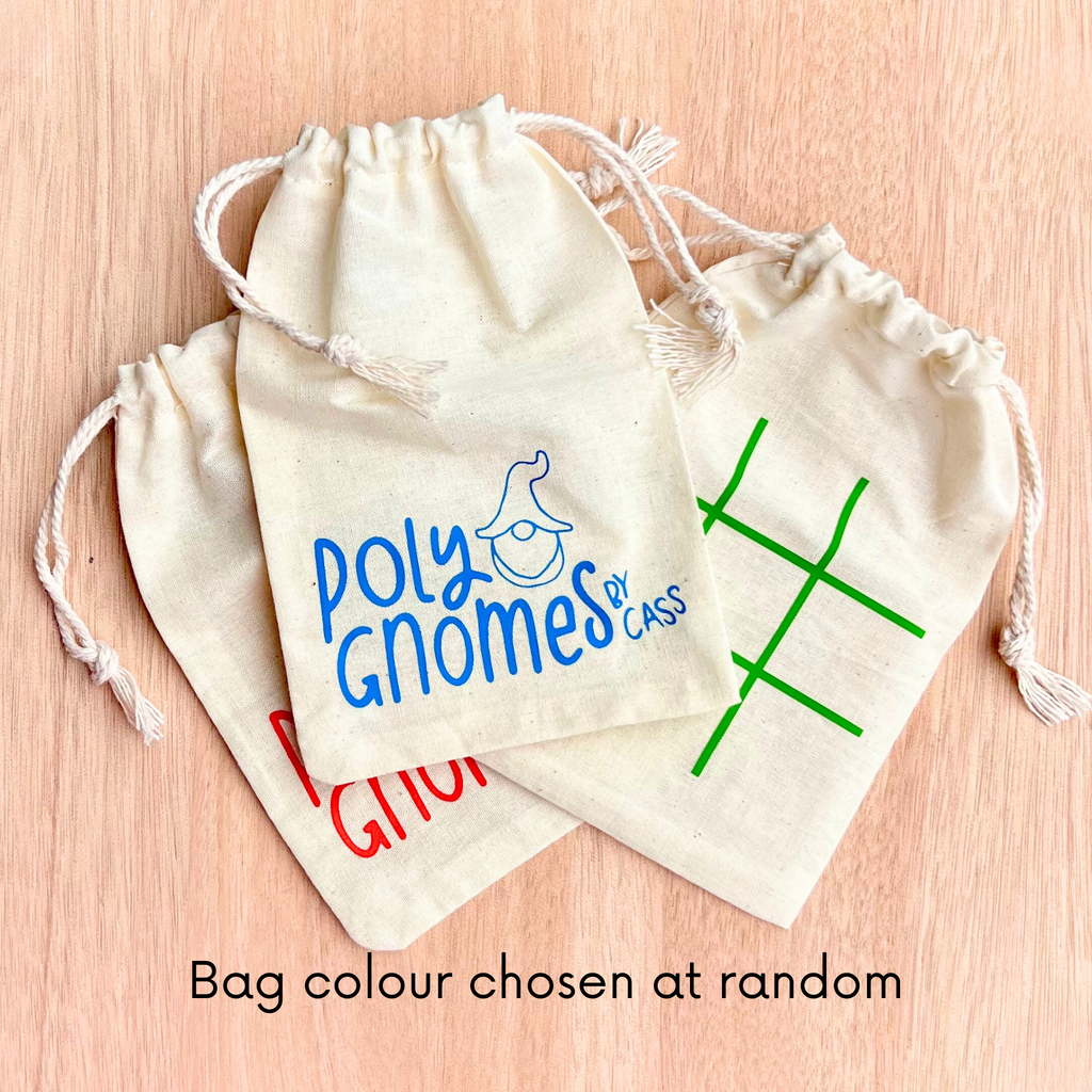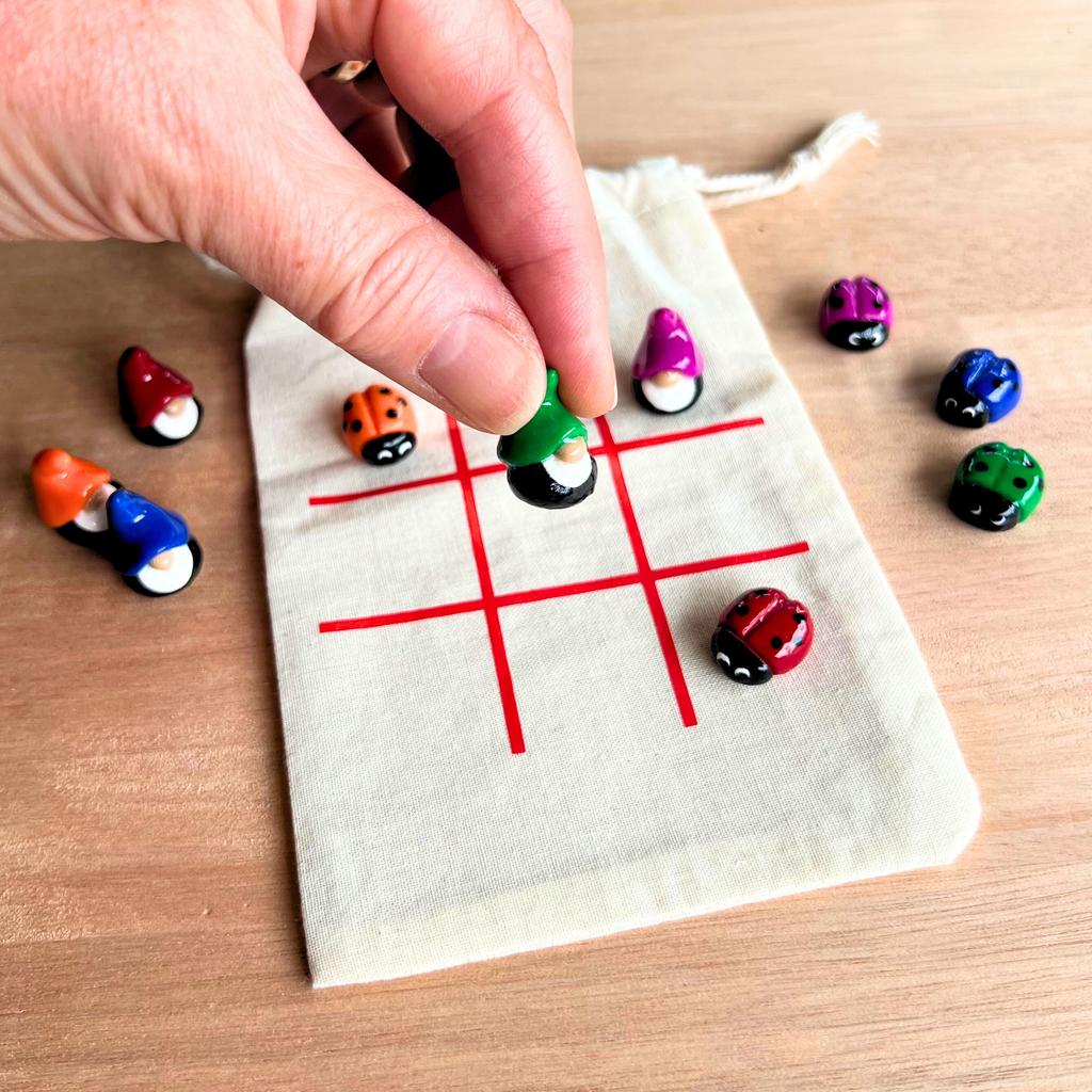Each set includes 10 pieces (the perfect number for tic tac toe) with five colourful gnomes (approximately 2cm tall) and five matching ladybugs (ranging from 1.5cm to 2cm in length), all handcrafted from polymer clay, with hand painted spots on the bugs, and glazed with resin for a vibrant, glossy finish.