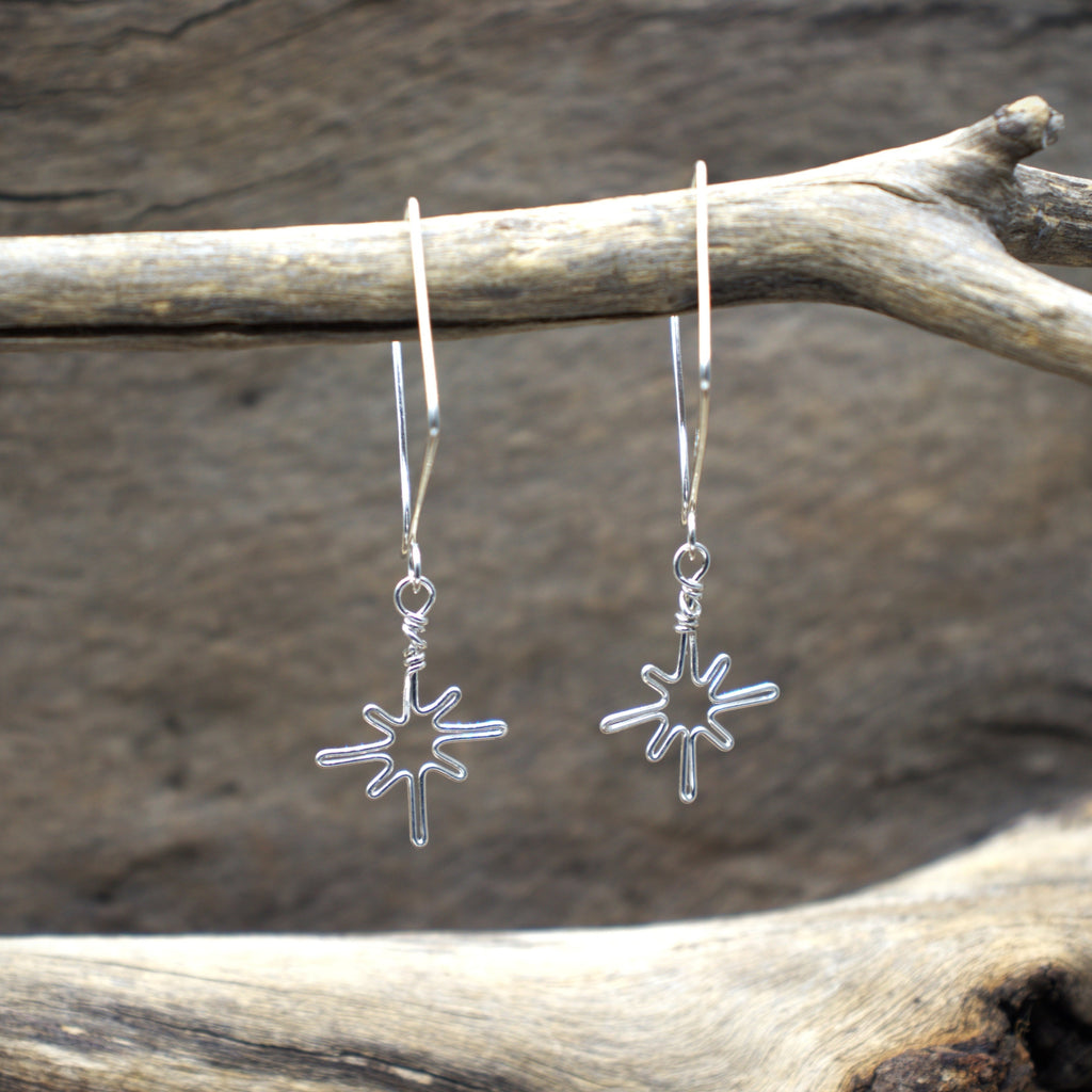 Stunning handmade sterling silver To the Stars earrings. A blend of modern and contemporary design. This edition, To the Stars - I, features geometric square-shaped hooks with a single 8-pointed star dangle on each earring.