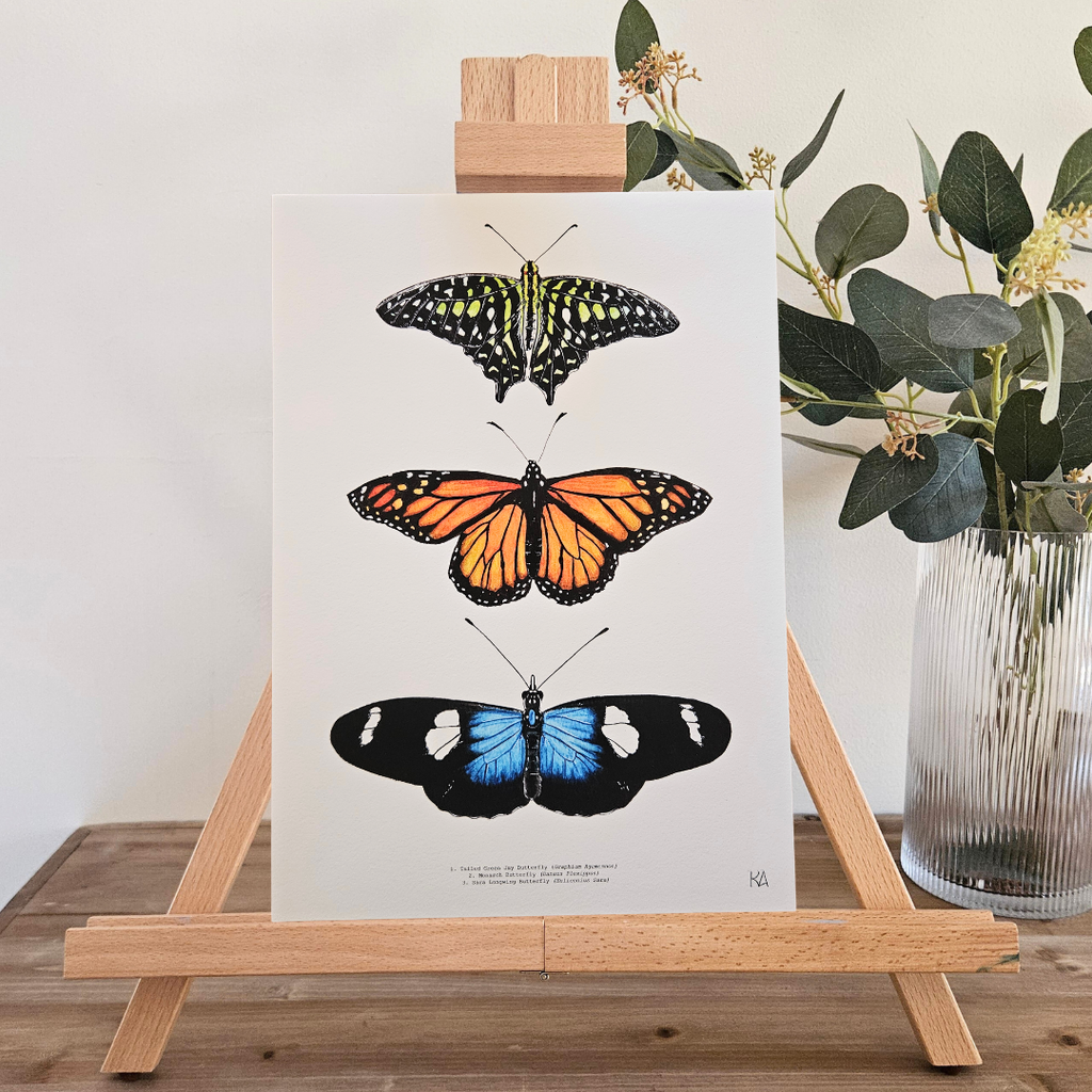 A hand-painted celebration of the beauty and diversity of butterflies. This artwork features the Tailed Green Jay Butterfly, Monarch Butterfly, and Sara Longwing Butterfly, each carefully illustrated to highlight their unique colour, pattern, and graceful form.