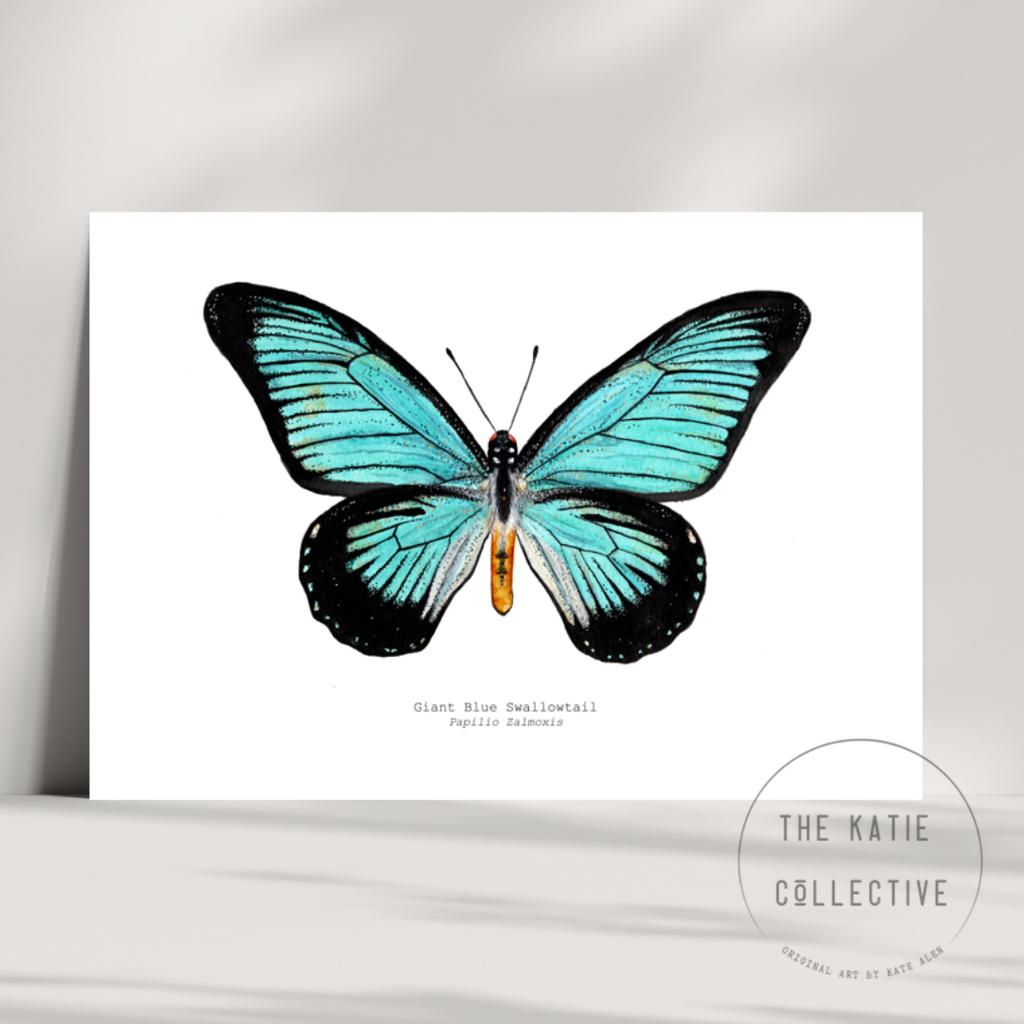 A hand-painted celebration of the beauty of the Giant Blue Swallowtail (Papilio Zalmoxis). This artwork captures the calming colour and delicate form that make this species so majestic. It's Africa's second largest Swallowtail, lives in Tropical areas and has an average wingspan of approximately 16cms.