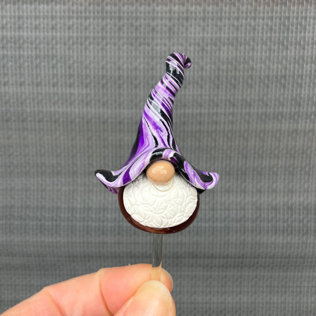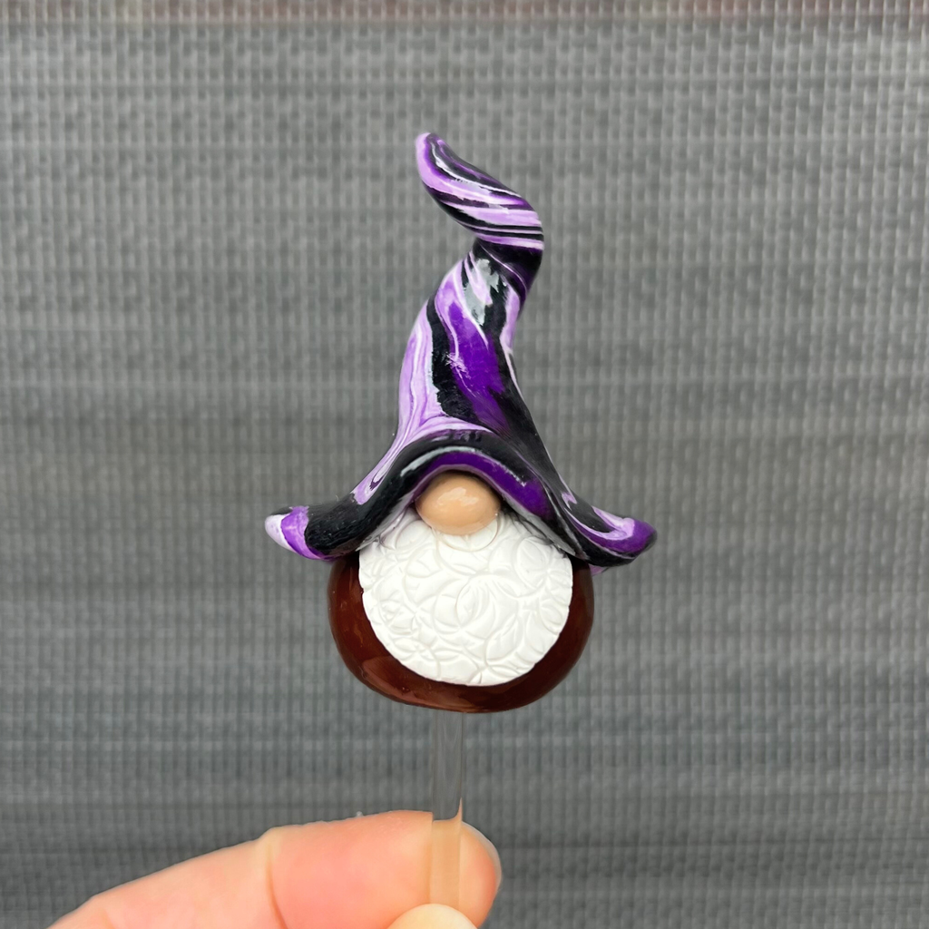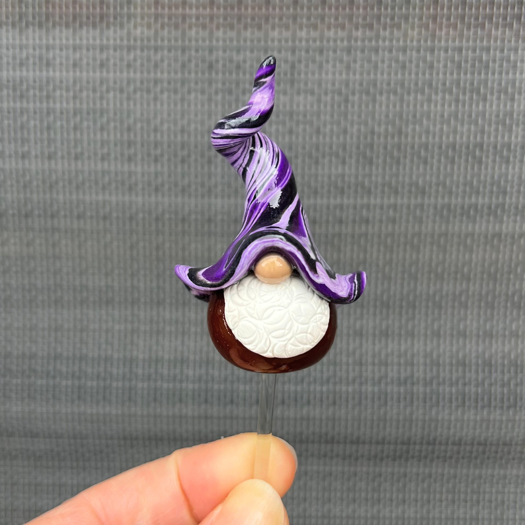 Handmade by me (Cass) on my back deck in East Gippsland, Victoria, each little fellow has a bottom of rich brown and a hat twisted with purple, black and white. They are created from polymer clay and finished with a glossy UV-cured resin glaze to make their colours truly pop.