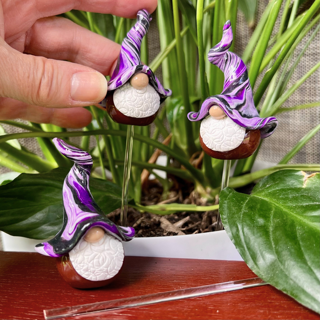 Each gnome comes on a 15 cm acrylic stick, perfect for popping into the soil of a houseplant. Prefer them free-standing? Simply leave the stick out and let them sit happily on a shelf, bench, or desk.