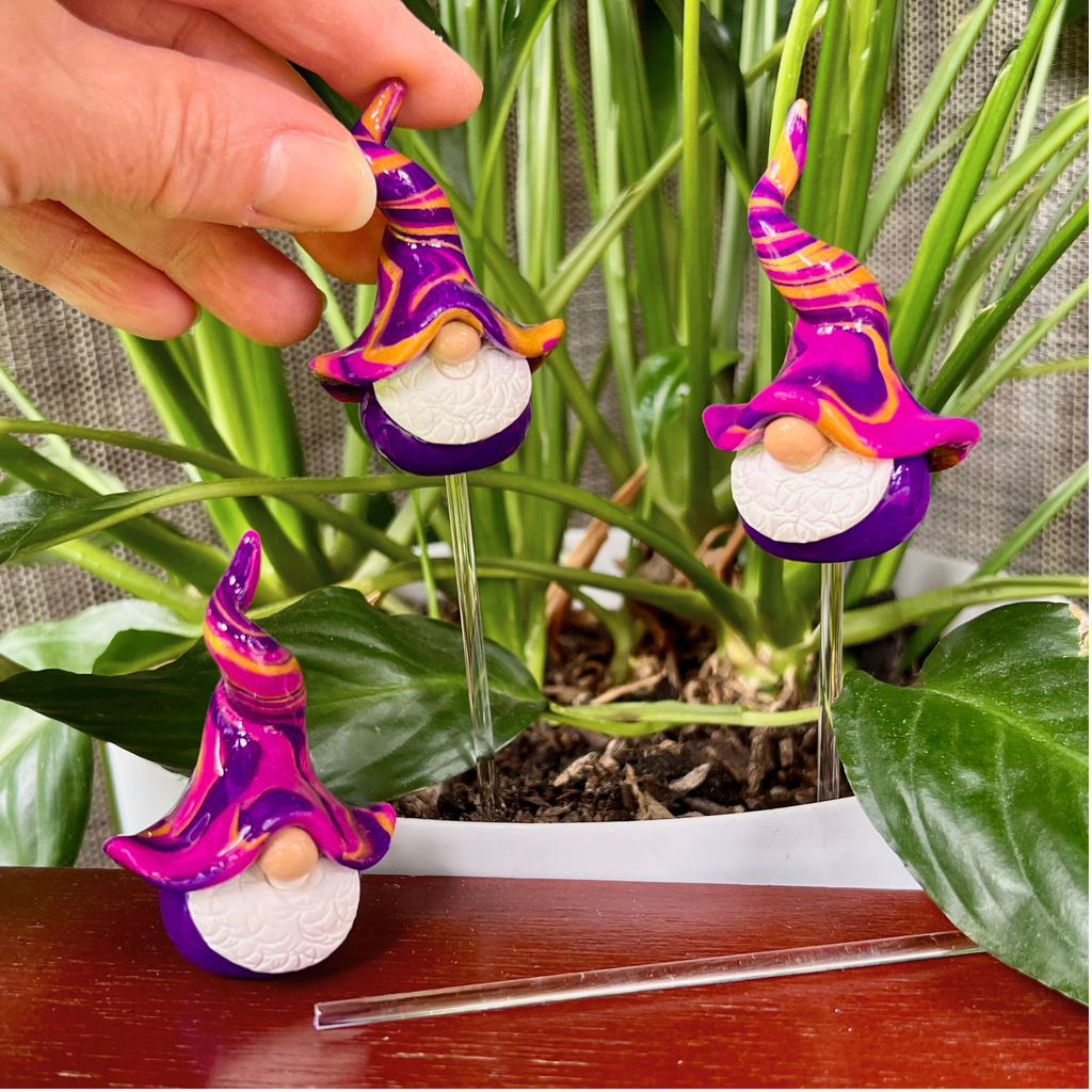 The gnomes each sit atop a 15cm acrylic stick that can be inserted into the soil of a house plant. Or leave the stick out so they can sit on a shelf, bench or desk.