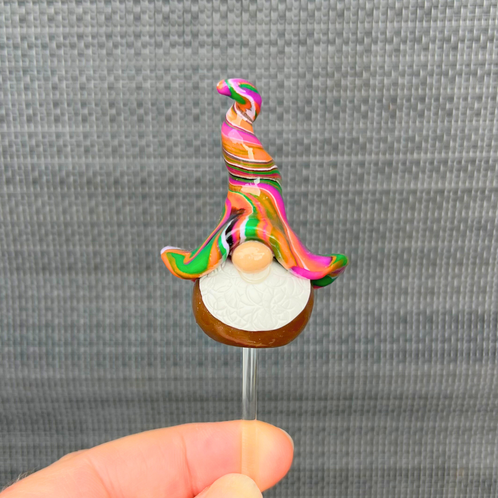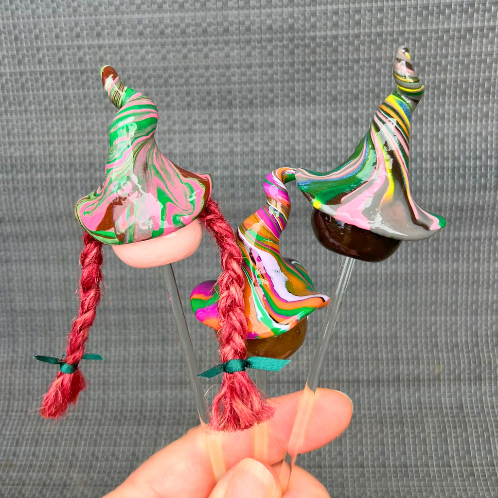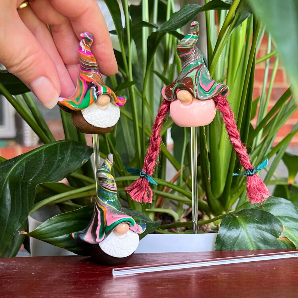 The gnomes each sit atop a 15cm acrylic stick that can be inserted into the soil of a house plant. Or leave the stick out so they can sit on a shelf, bench or desk.