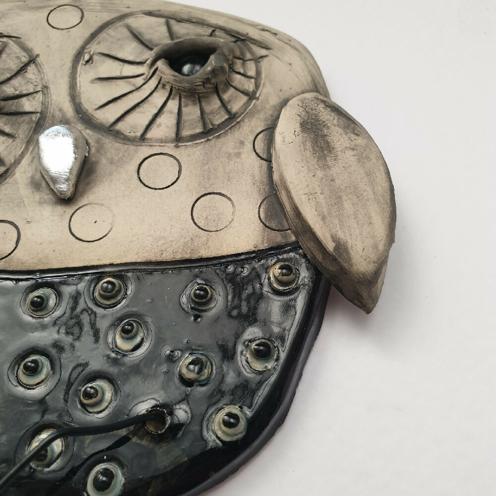 My favourite part of the process is applying underglaze washes-wiping back sections to reveal textures and depth, giving each piece its unique character. I love experimenting with finishes, blending glossy and matte surfaces for contrast. Sometimes, I use wax to preserve matt areas before dipping the piece in glaze, or I might brush glaze onto small areas. For an extra touch, I might incorporate silver/gold leaf, resin, or a lustre glaze, which requires a third firing to achieve its metallic finish. Each step in the process reflects my passion for texture, contrast, and the endless possibilities of clay.