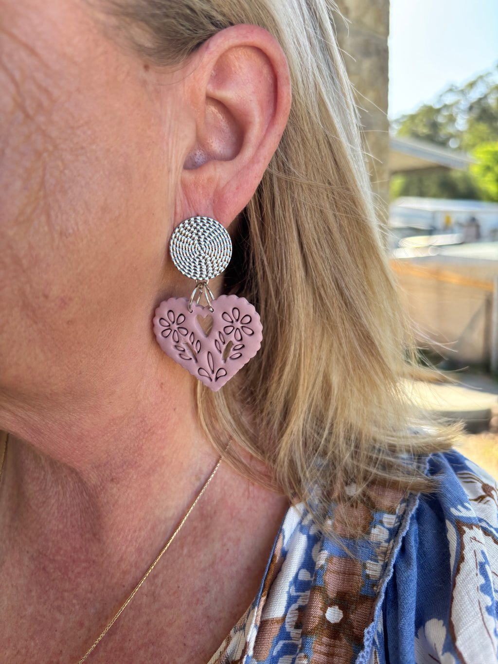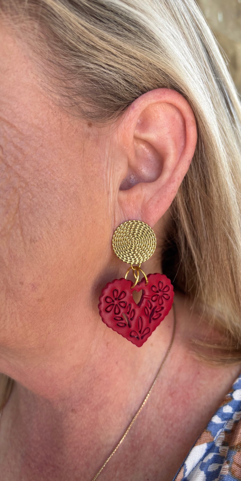 Each heart is handcrafted from polymer clay and paired with your choice of a textured gold or silver stainless steel stud, creating a bold yet wearable statement.