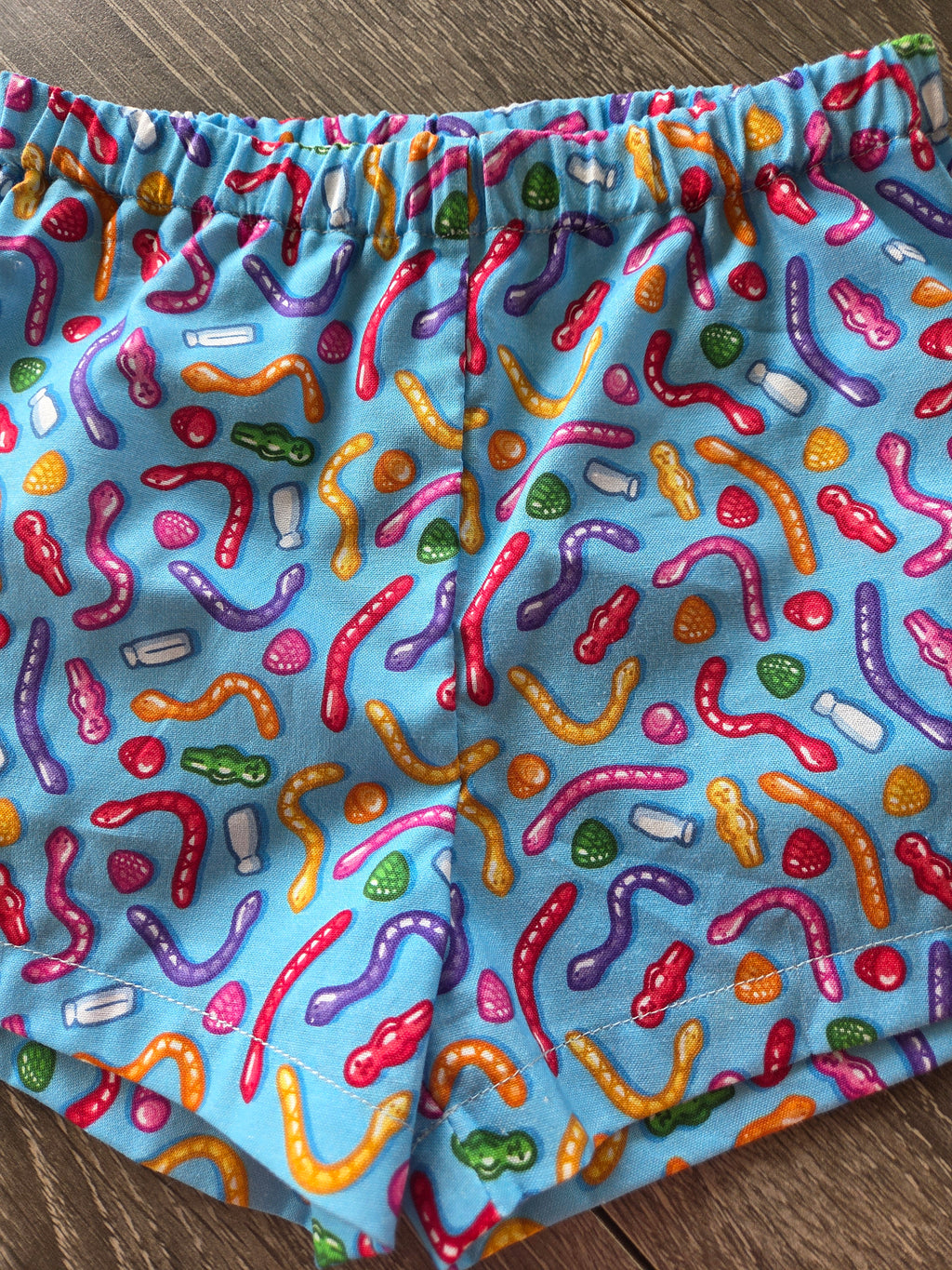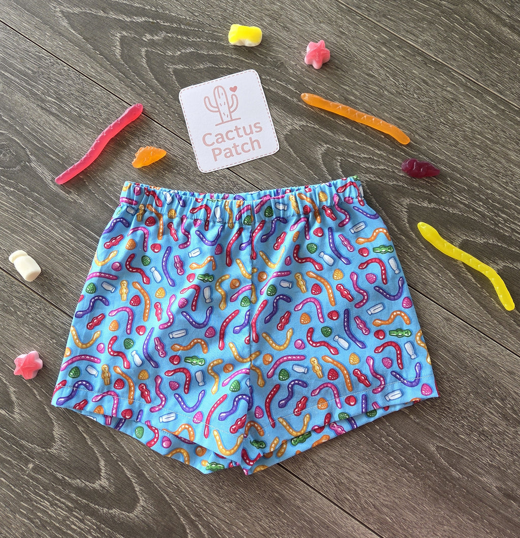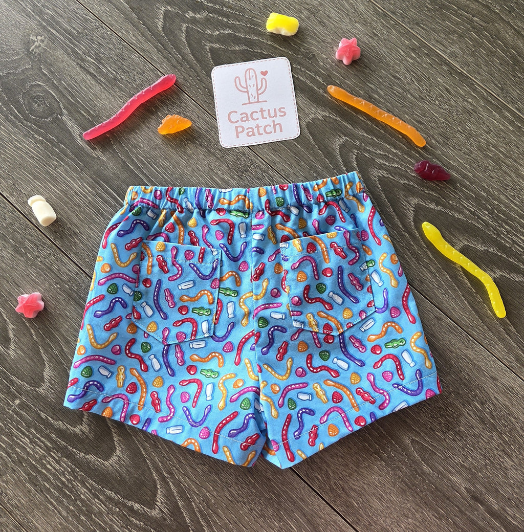 Bright, bold, and bursting with fun this pair of shorts is crafted from a Laura Wayne licensed print "Aussie Lollies" — a playful and quirky celebration of classic Aussie sweets. Gummy snakes, jelly babies, and milk bottles dance across a vibrant blue background, making it a fun pair of shorts for your little lolly lover.