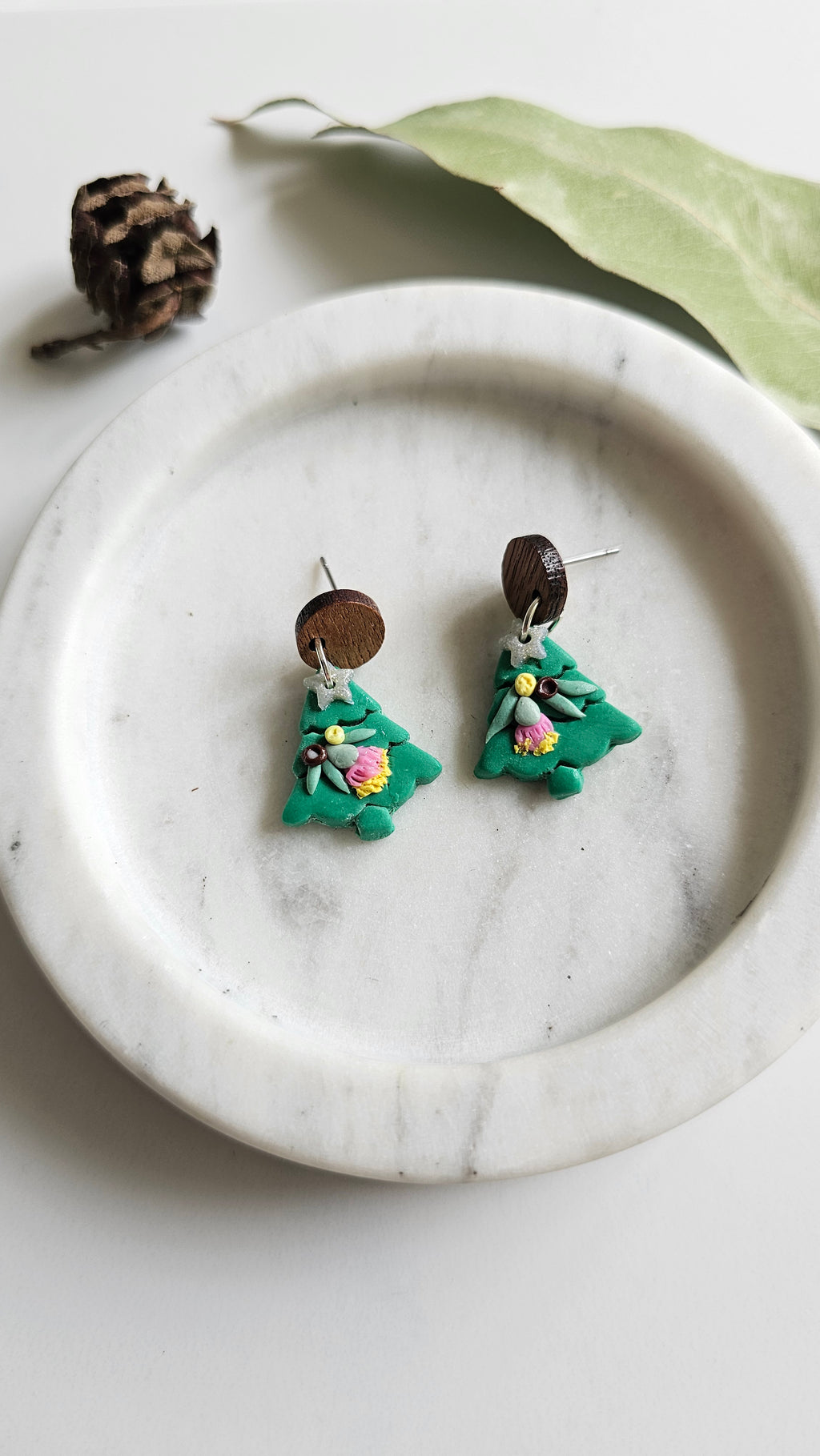 Delicate Australian polymer clay native christmas trees decorated with tiny pink gum blossoms and gum leaves.