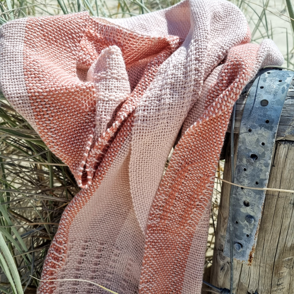 I have used three different shades of pink cotton from Bendigo Woollen Mill in Victoria for this scarf. This creates some extra interest to the design with the pickup stick pattern generating a tactile quality. This cotton is lovely and soft, natural with a durable feel that drapes well.