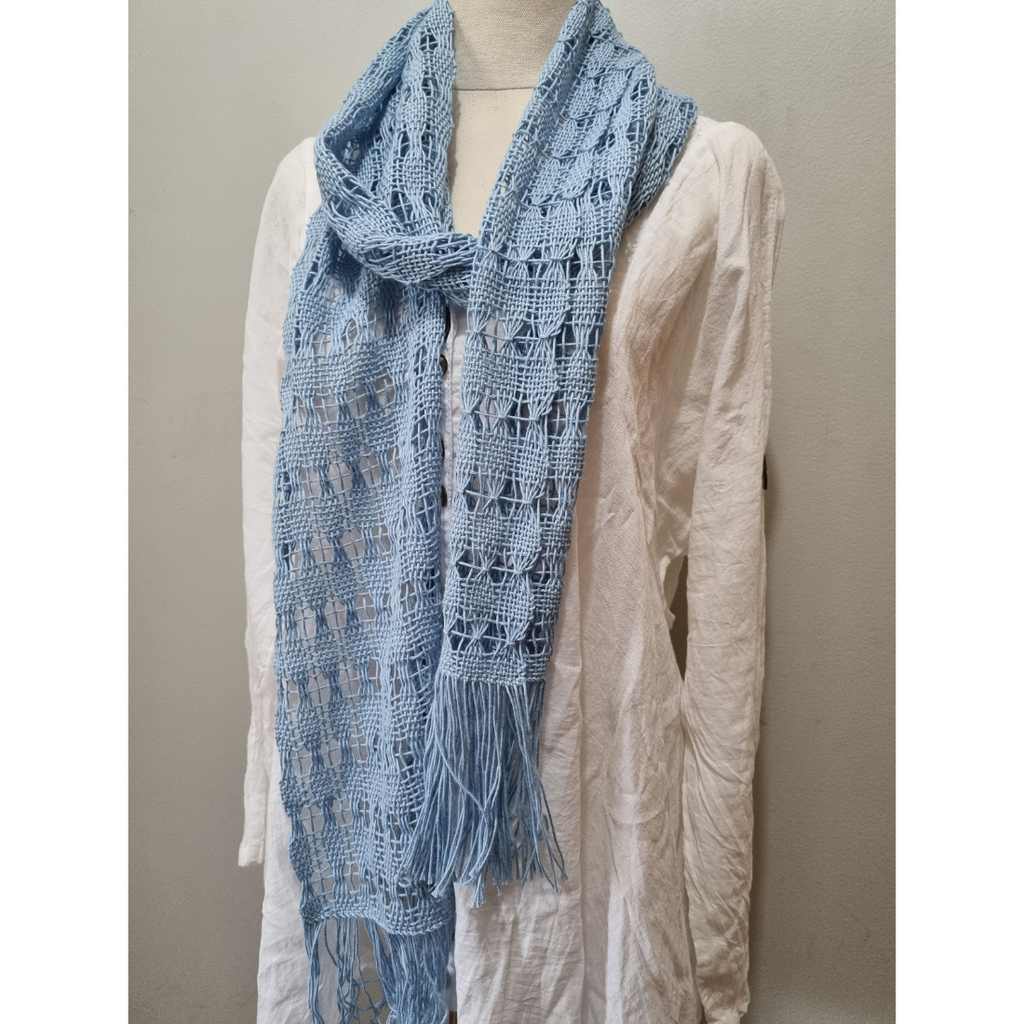 The cotton has come from the Bendigo Woollen Mill in Victoria, and I love the shade of light blue. This cotton is lovely and soft, natural with a durable feel that drapes well. The scarf has a delicate, lacy and airy texture and is a tactile, lightweight accessory.