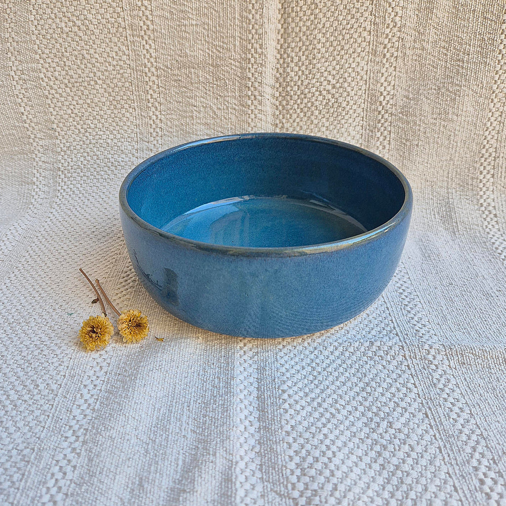 This bowl is wheel thrown and dipped glazed in blue. Perfect size bowl for small salads or large individual dishes such as soups, pasta or berry bowl.