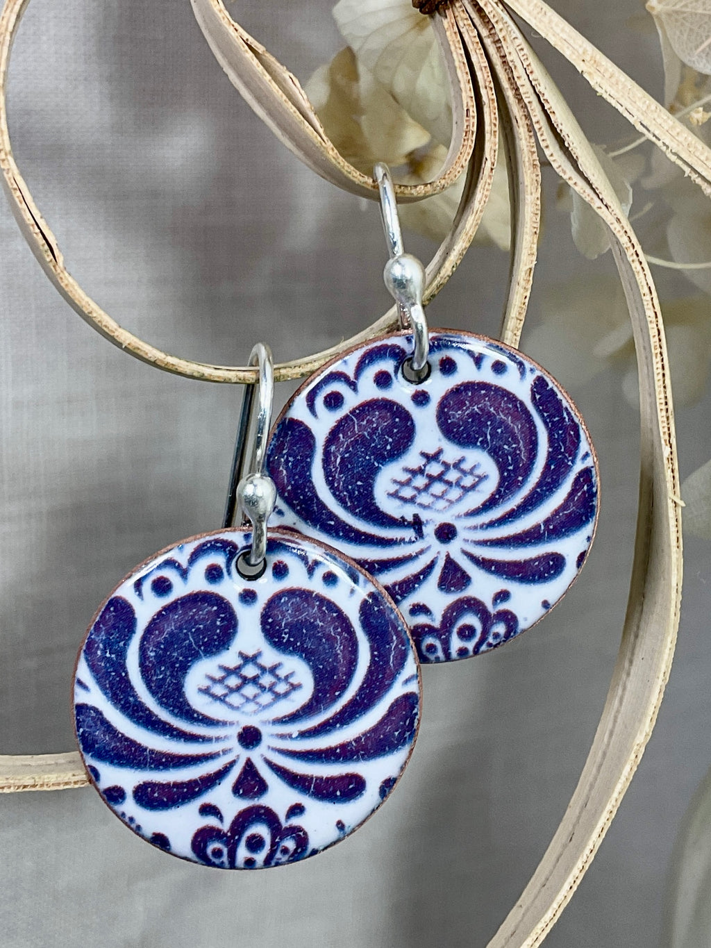 These earrings have a white enamel base. Once the white base has been fired and cooled I’ve added a beautiful blue floral decal , letting it dry overnight. One dried the decal is fired in my till until it is fused to the base enamel