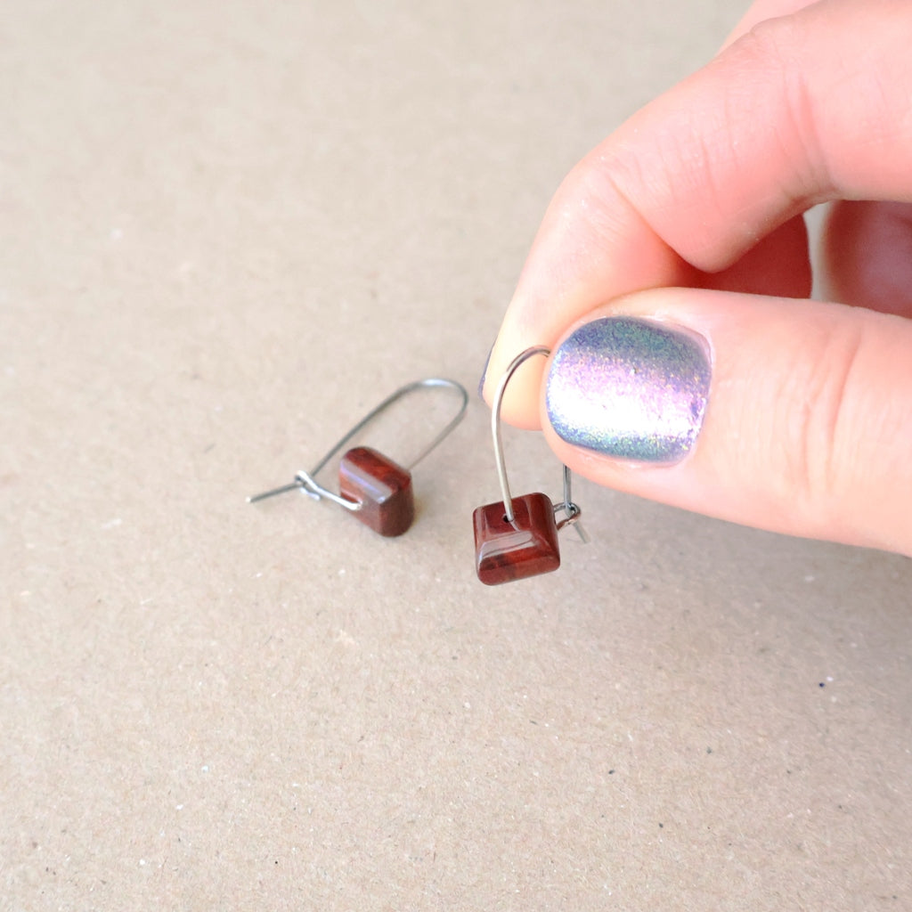 If you love dark, earthy colours, then these are the Earrings for you! Each stone is a unique combination of red, brown, and black, and their minimalist design makes them perfect for everyday wear.