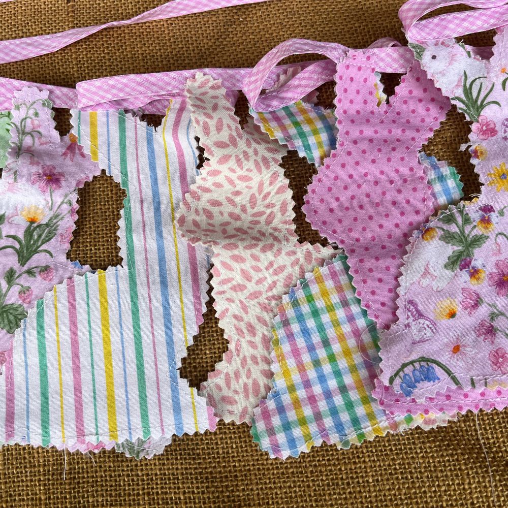 Add a touch of charm and color to any space with this beautiful handmade bunny bunting. Each bunny is carefully crafted from high-quality fabric in a variety of colours, creating a cheerful and eye-catching display. Perfect for easter, nurseries, parties, or as a lovely home décor accent. The bunnies are securely stitched and strung on a durable bias-binding, ready to hang and brighten your room.