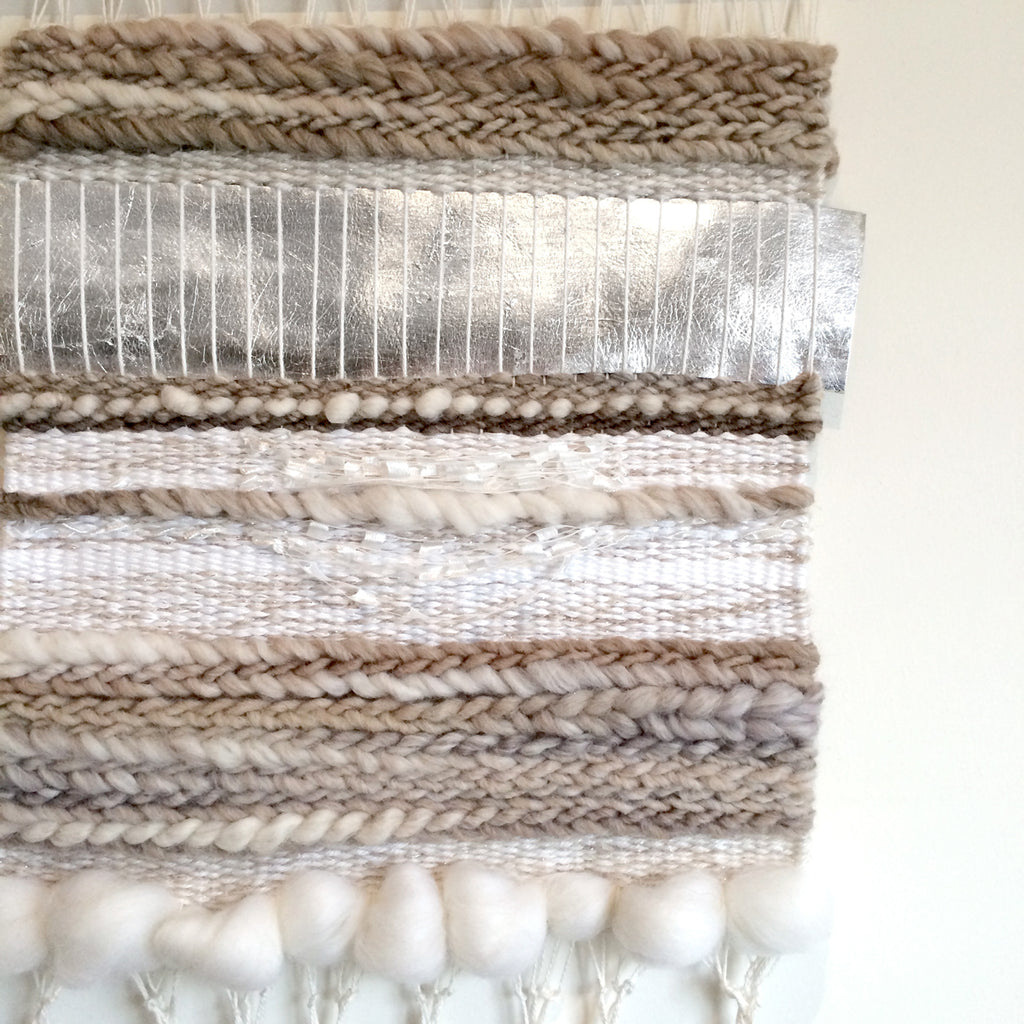 Hand woven MEDIUM tapestry in cream and coffee brown handspun merino wool and roving with sparkly accents and leather silver element, hangs from a clear oak wooden dowel.
