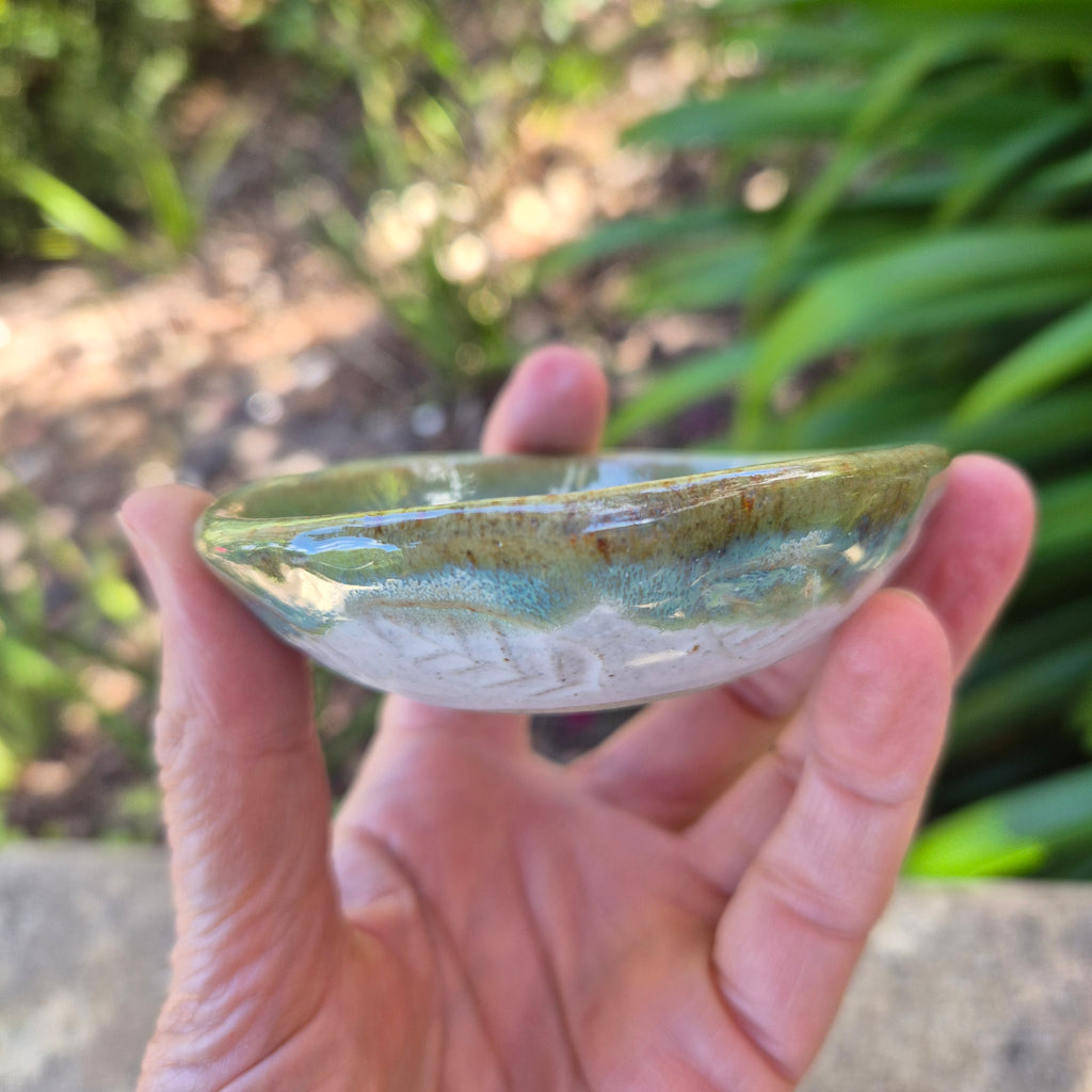 Soft green and white gloss glaze with leaf imprints along the edge.