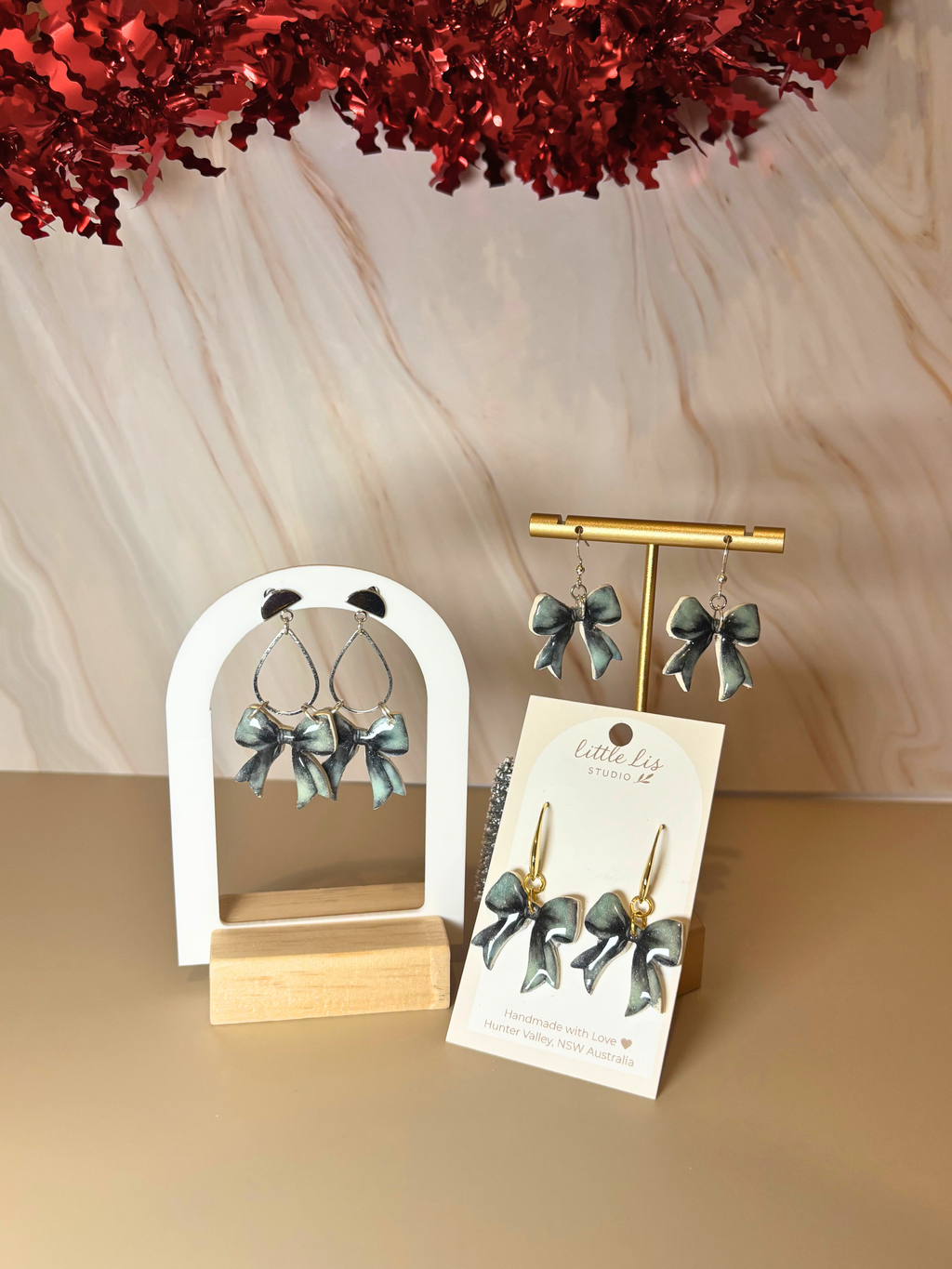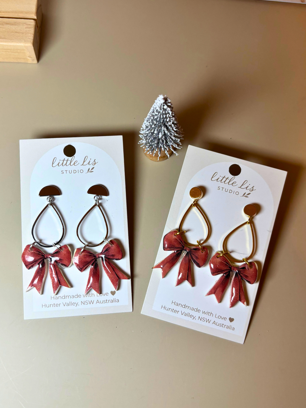 Handmade, light weight polymer clay Christmas themed bow earrings. Hypoallergenic silver or gold Hooks, Hoops & Studs.