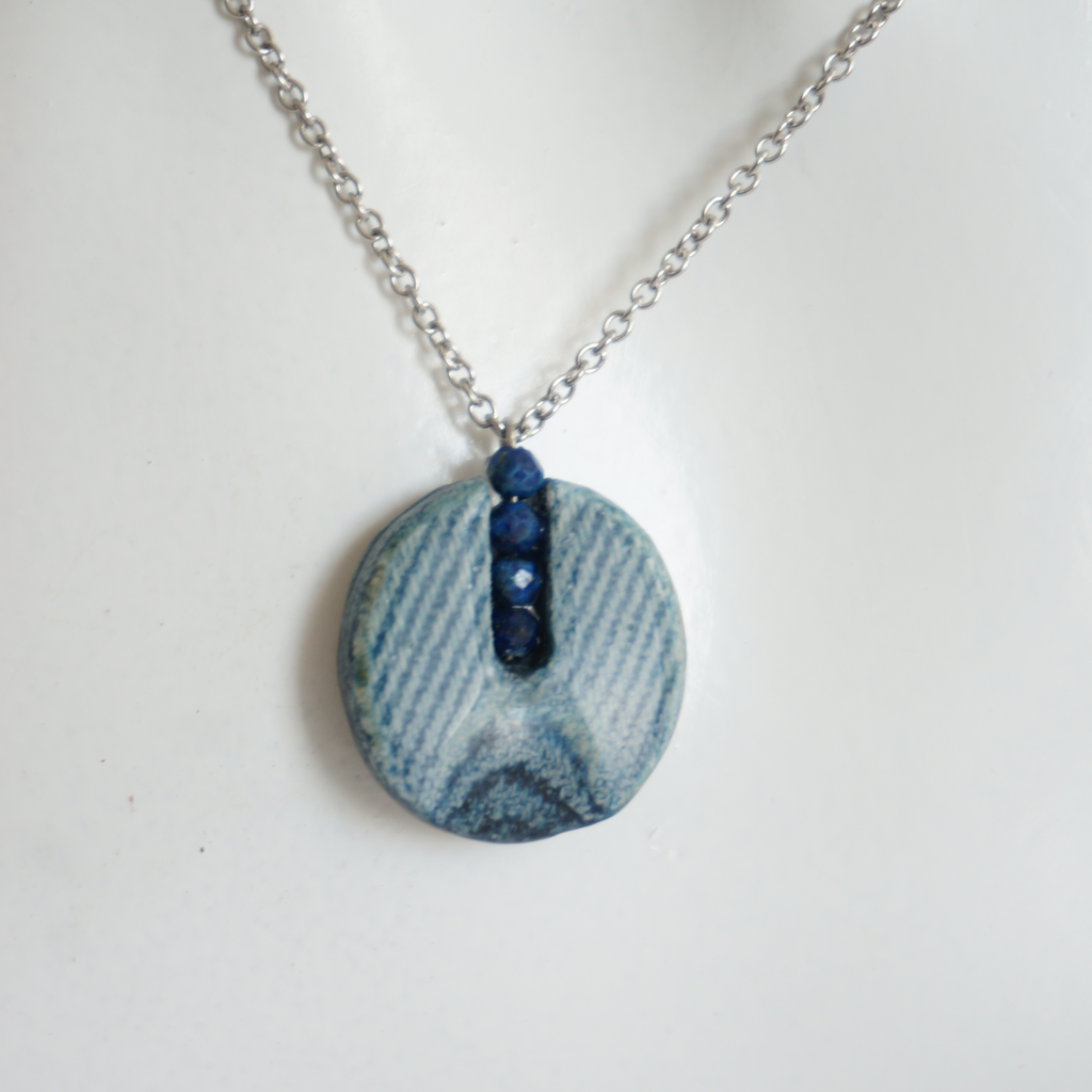 Necklace from the "Circles" collection. Denim, resin, Lapis Lazuli stone beads and stainless steel.