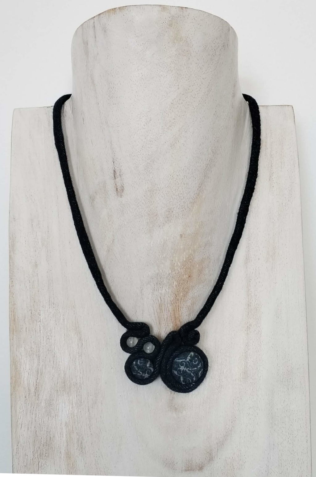 One-of-a-kind necklace made from denim and natural selenite beads. Sculptural textile forms meet the soft, luminous glow of selenite, creating a striking balance between raw texture and delicate crystal.