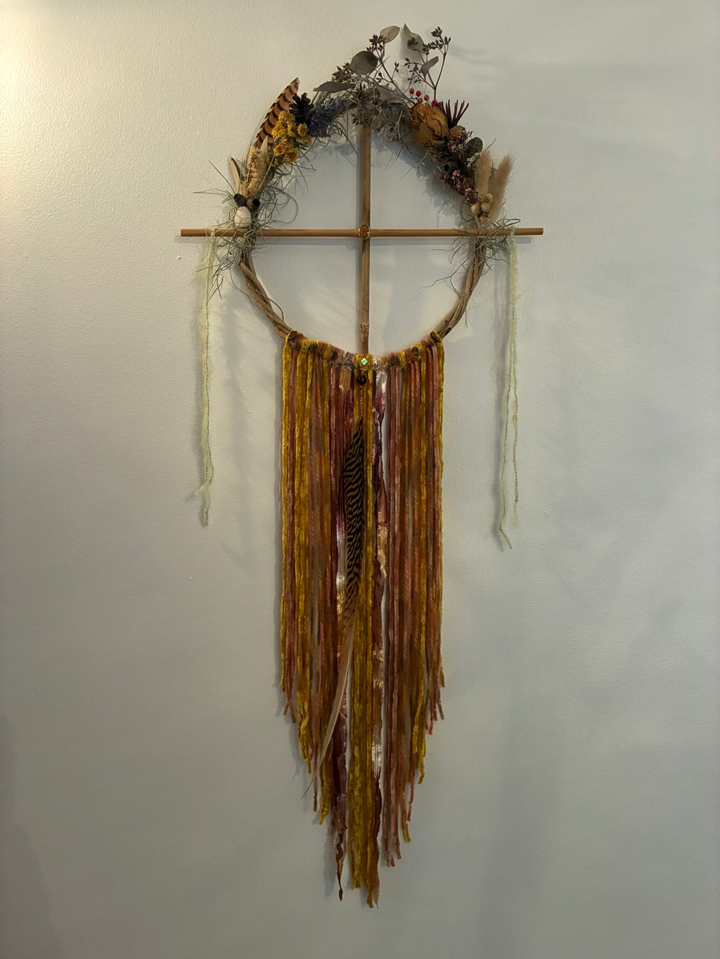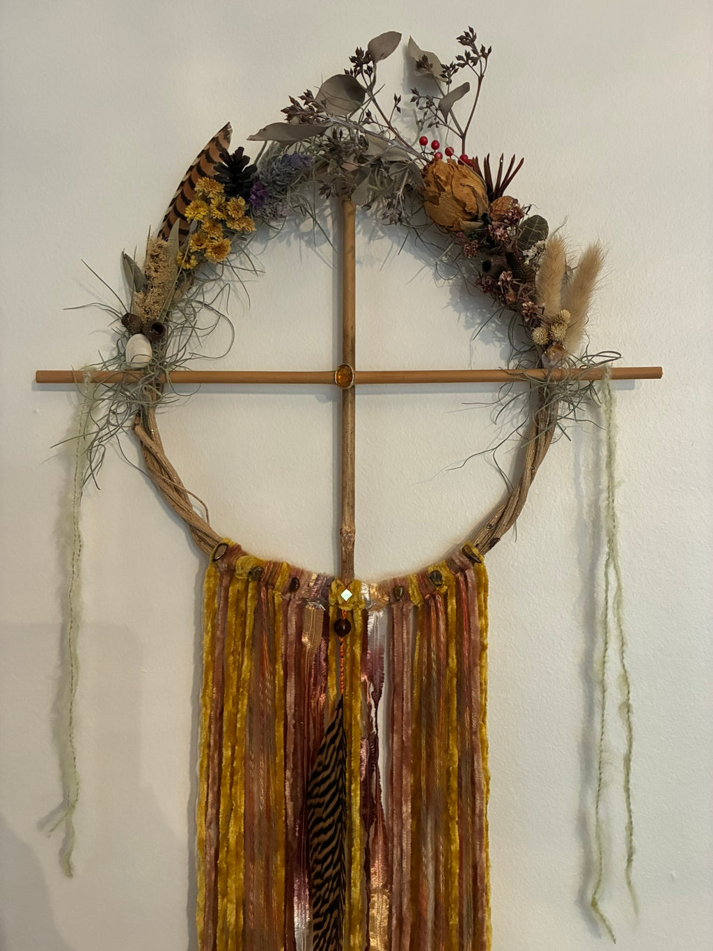 Dream Catcher Wreath is hand crafted in celebration of Lammas. Included in this Wreath are the five elements of Earth, Air, Fire, Water & Spirit. Nature is made up of all of these elements as are our bodies. There is no separation. My intention in creating this Wreath is that it may serve as an artful reminder of our deep connection to nature, including her elements, cycles and seasons of change in the circle of life.