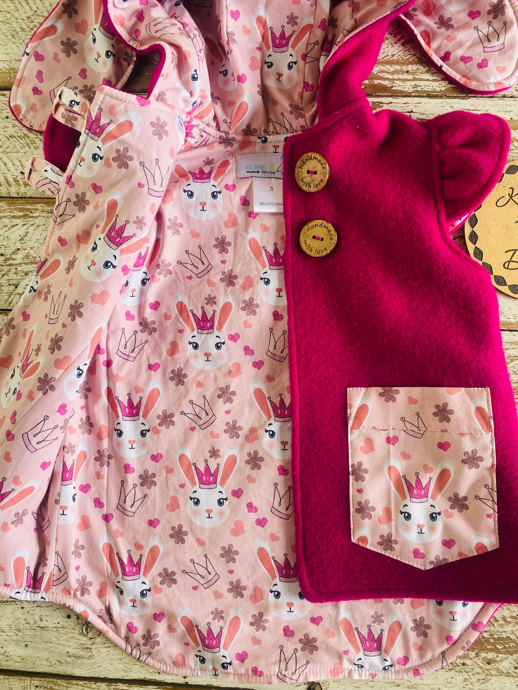 Vest features a three- piece hood with cute bunny ears, flutter sleeves, extended back, front pockets and two fabric loop closures with engraved coconut shell buttons.