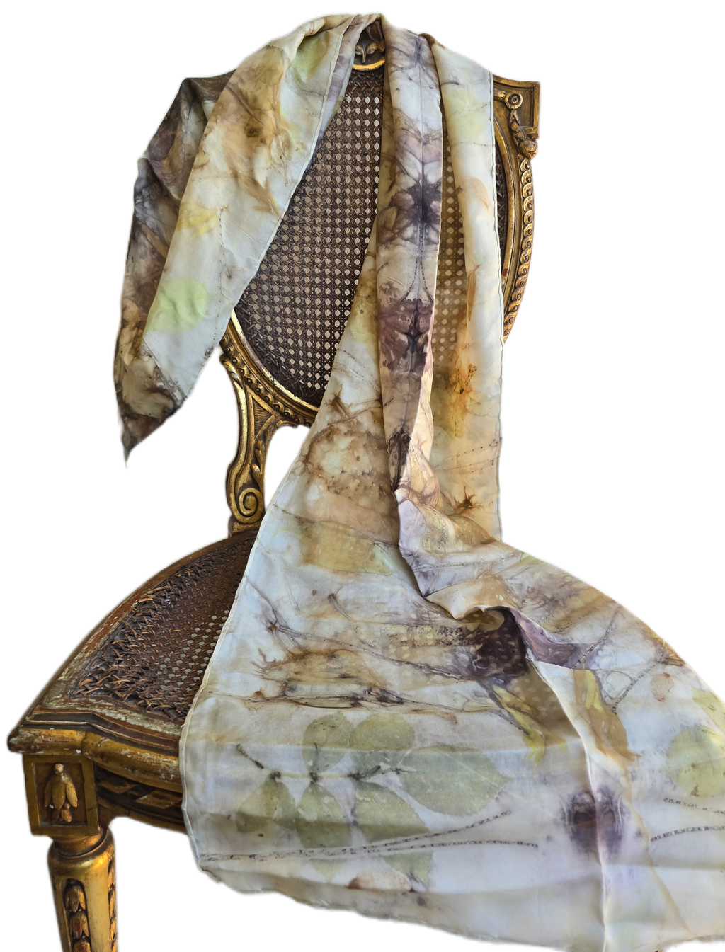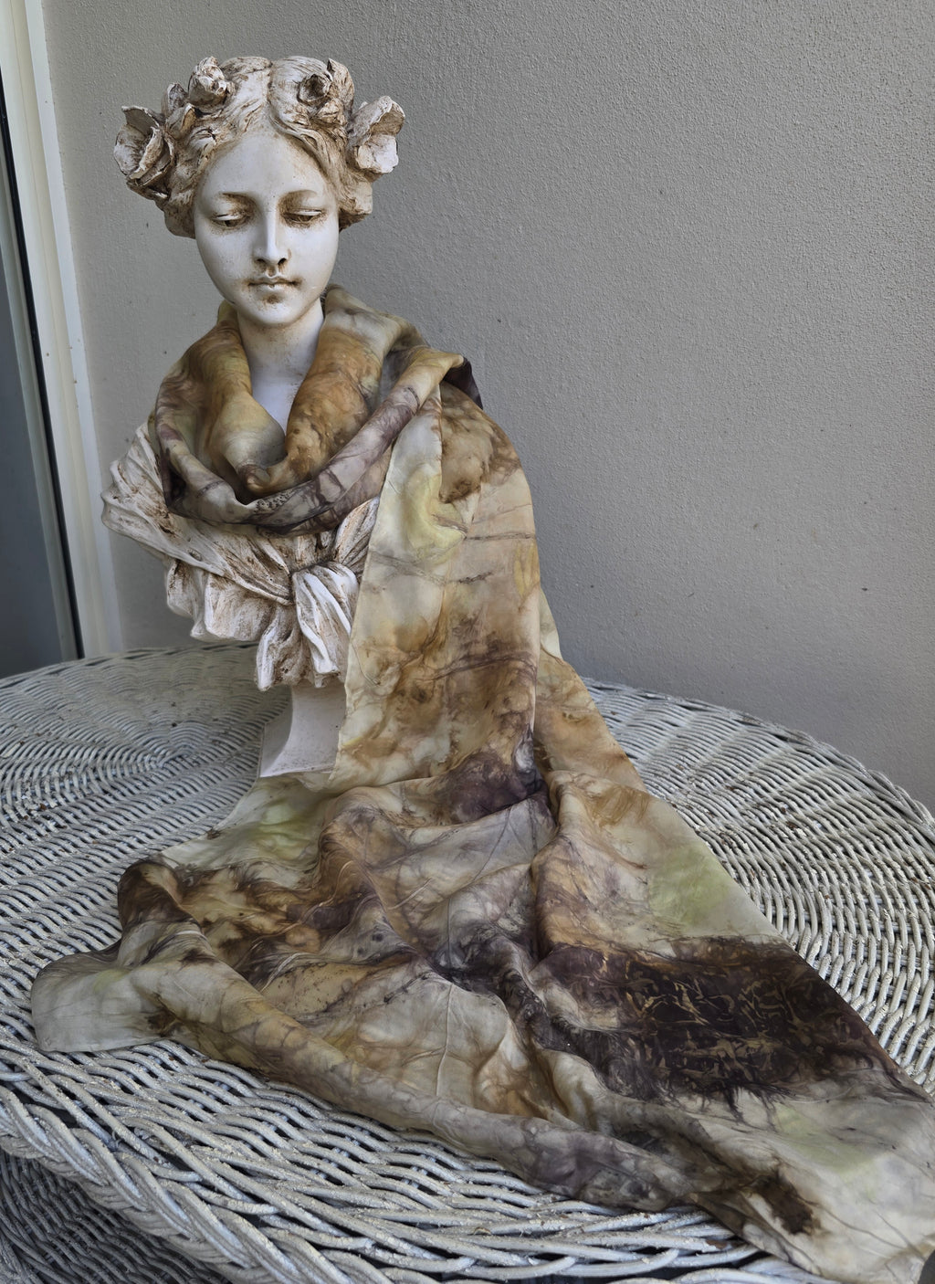 Pure silk Eco Printed scarf. Leaves used from the Sunshine Coast. Tannins have created some interesting colours on this scarf.