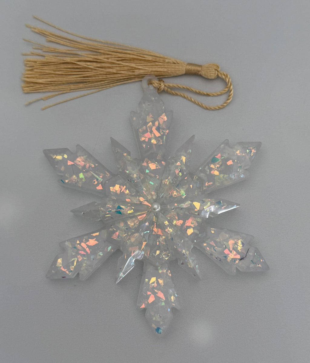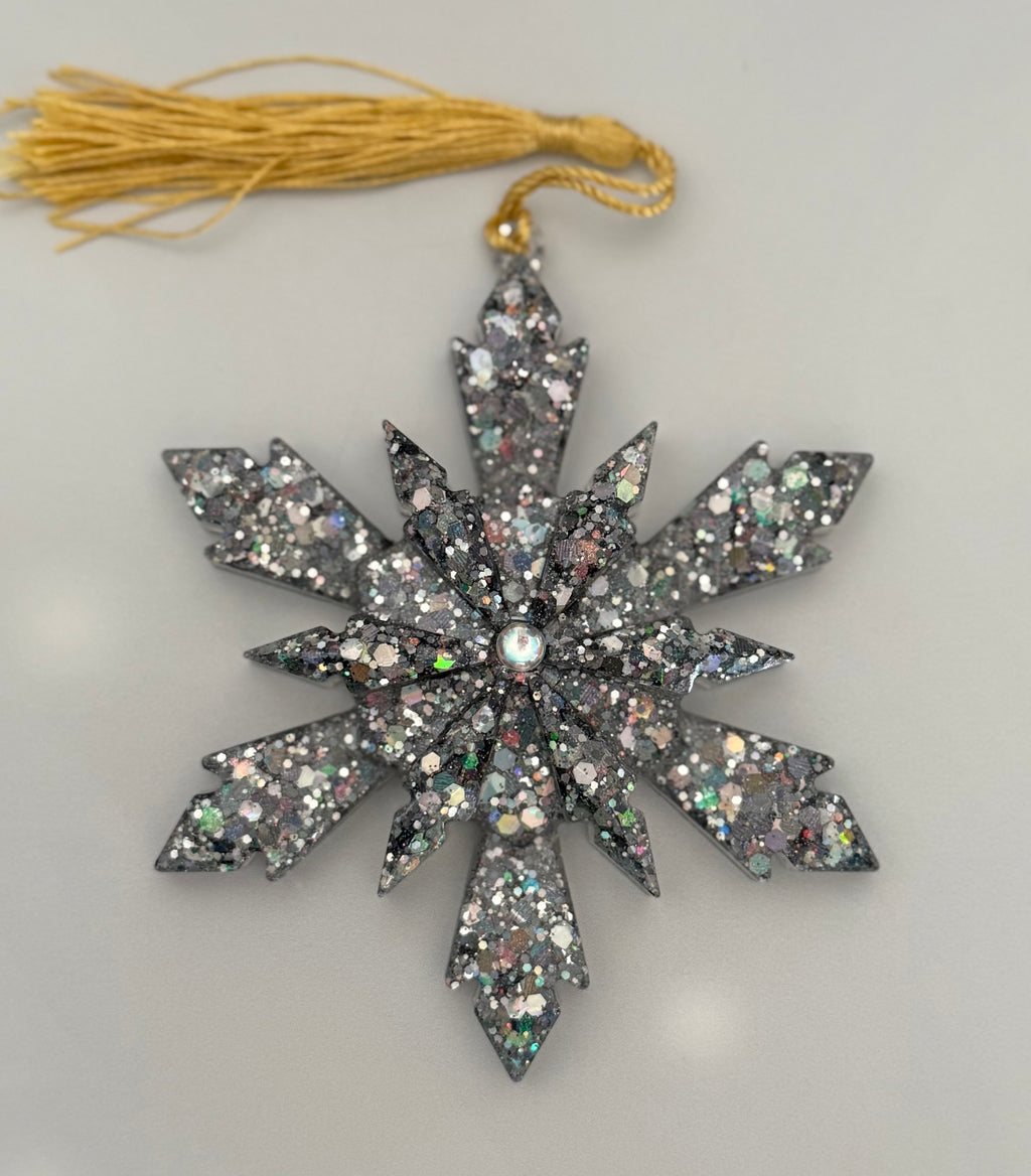 These glittering snowflakes love being the star of your Christmas tree, a sun-catching window charm, a sweet little hanging above a cosy bed, or a sparkling centrepiece for your table.