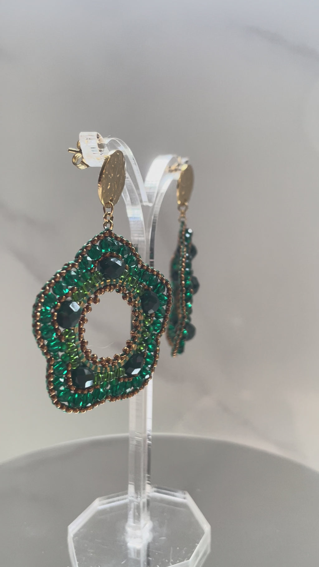 "Fleur" emerald green beaded earrings are filled with intricate detail. Featuring a collection of beautiful quality glass beads lovingly hand-beaded on a gold-plated stainless steel circle with a hammered texture gold-plated stainless steel stud post.