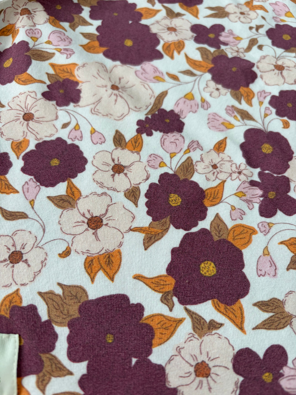 Beautiful floral tee that will match almost anything in baby’s wardrobe! Made from organic Australian milled cotton lycra in burgundy and pale pink flowers on a cream base with mustard leaves. So so pretty and modern!