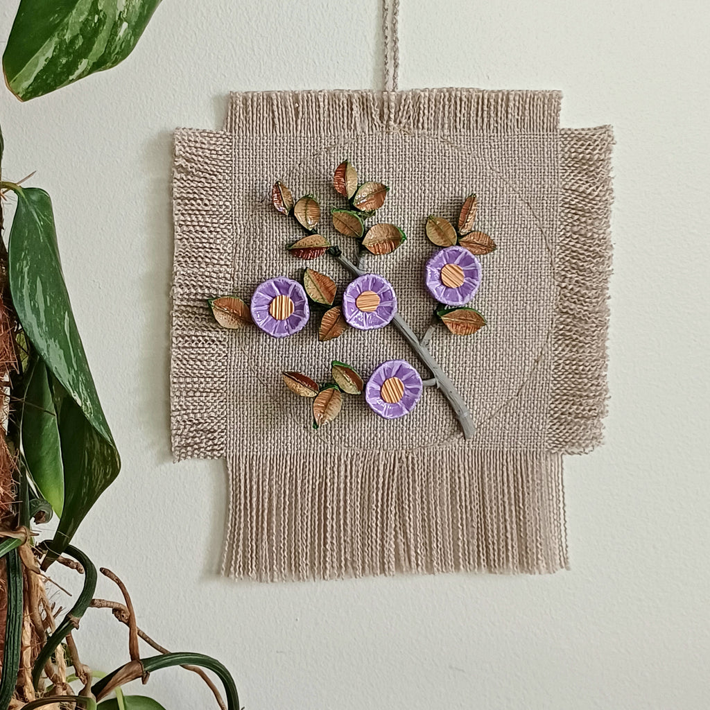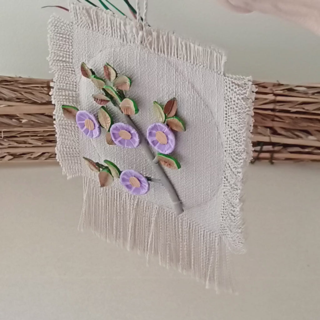 The purple flowers are handmade from natural earth clay and the small leaves are from a palm leaf. The branch is from the stem of a palm flower.