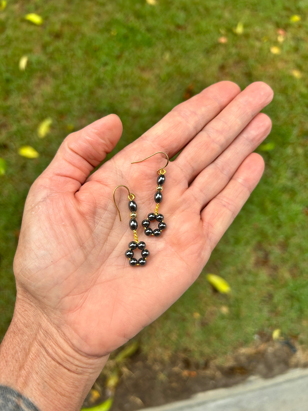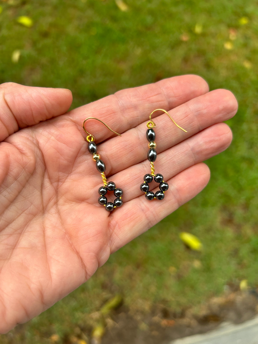 These beautiful earrings are made with repurposed Hematite beads.