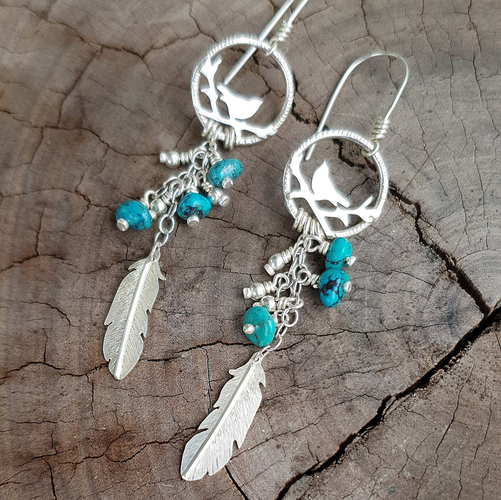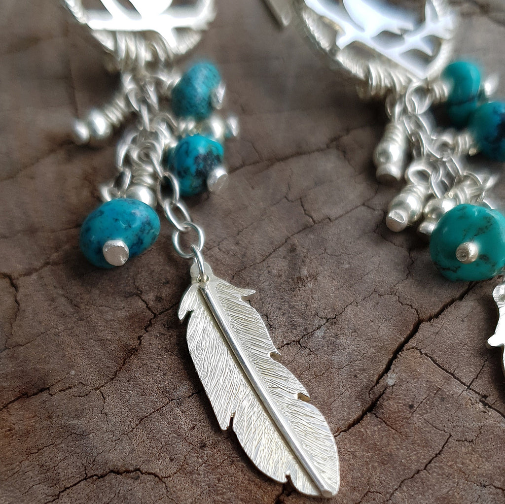 Truly one of a kind pair of earrings, made by hand using noting but sterling silver sheet, wire, chain and beads, with turquoise beads adding a splash of colour.